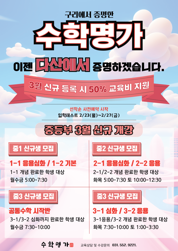 안녕하세요 수학명가학원입니다 다산으로 이전하면서 새롭게 중등부 신설 개강합니다. 선착순 사전예약 시작 입학테스트 <기간> 2/23(월)~ 2/27(금) <시간> 오후 3시~오후 8시 중 선택 학기별 50분 (30문제) 입학테스트에 통과한 학생만 선발 3월 등록한 학생 수강혜택 교육비 50% 지원 교육상담 및 수강문의 031. 552. 9221. <img src="https://blogthumb.pstatic.net/MjAyNjAyMjNfMTM4/MDAxNzcxODMyMzUyMTk2.jdrG5AYsQ5JGIueJtZfd21Nmhyv0j3B37LNVAv8ZHEMg.uHn-a_lCPjBjAW00VIT9Y0H4mHKxOCRkl91Wq3PvujYg.PNG/KakaoTalk_20260212_113223782.png?type=s3" />