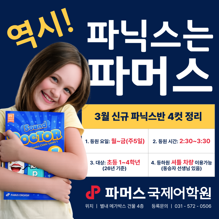 3월 개강 | 선착순 마감 한 반 정원 6명으로 빠르게 마감되고 있습니다. 등록을 원하시는 학부모님께서는 서둘러 주세요 상담 및 레벨 테스트 문의 환영합니다! 안녕하세요, 파머스국제어학원 별내브랜치입니다! 파닉스 상담을 오시는 학부모님들의 공통된 고민이 있습니다. “영어… 이제 시작해야 할 것 같은데…” “파닉스는 배웠다는데 왜 단어를 못 읽지?” “읽기는 하는데 발음이 너무 불안해요…” 걱정스러운 표정으로 조심스럽게 말씀을 꺼내십니다. 이 고민, 3월이 딱 잡아줄 타이밍입니다. 파닉스는 그냥 알파벳을 외우는 수업이 아닙니다. 매일 1시간, 제대로 된 파닉스 수업이 시작됩니다! 알파벳을 하나도 모르는 친구....... <img src="https://blogthumb.pstatic.net/MjAyNjAyMTlfMTc3/MDAxNzcxNDkwMTUwMTYw.oXZYPwHaXmFz2VACeyaTMQdHx8l1dLwqDBmS2nyWUbEg.dOPoa_osR3iYhZ3asOxfINdeyTjKFq_SaEoiu6tcGC8g.PNG/1.png?type=s3" />