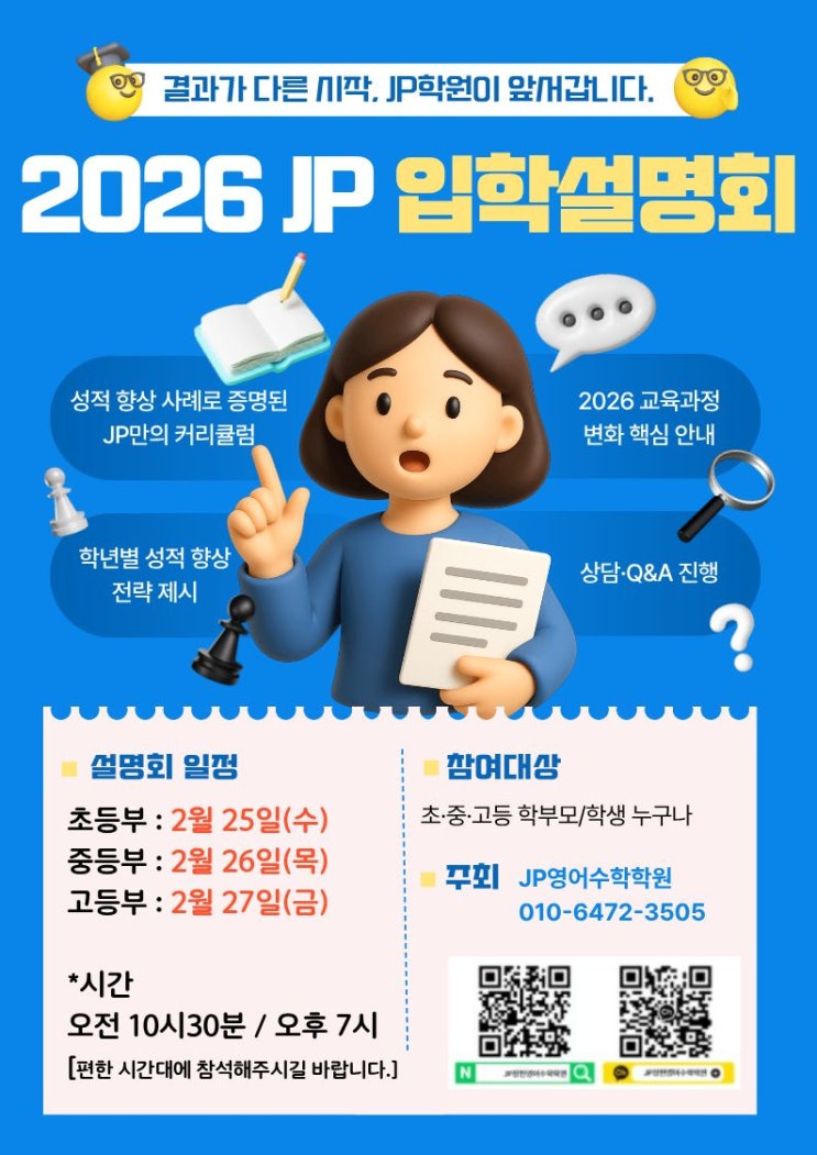 2026 JP 입학설명회 안내 결과가 다른 시작, JP학원이 함께합니다. 안녕하세요. 지금 필요한 우리들의 학원! jp학원입니다. 벌써 새 학기가 다가오고 있어요! 새 출발은 언제나 설레지만, 준비의 깊이에 따라 결과는 달라집니다. 새 학기를 준비하는 이 시기는 학생의 공부 방향을 한 번쯤 점검해보는 중요한 시점! 교육과정은 계속 달라지고, 평가 방식은 점점 세분화되고 있으며, 학년이 올라갈수록 요구되는 학습의 깊이도 분명히 달라지기 때문이에요. 이 흐름을 제대로 알고 시작하는 것, 그 작은 차이가 결국 결과의 차이로 이어집니다. 그래서 #진접학원 #진접영어수학학원 JP학원은 2026 입학설명회를 통해 학년별로 꼭 알고 가야 할 핵....... <img src="https://blogthumb.pstatic.net/MjAyNjAyMjBfOTUg/MDAxNzcxNTU2OTU0NzAx.KcPFbEVH-TTTmBHX7uxEBQqEtY2R6CZz_yDnjomejtsg.GyCRoPc_mG-E8sYTHFQKi1Ibx0X4_gfL4vGrWT-UVsQg.JPEG/%C1%A6%B8%F1%C0%BB_%C0%D4%B7%C2%C7%D8%C1%D6%BC%BC%BF%E4._-_2026-02-19T183823.710.jpg?type=s3" />