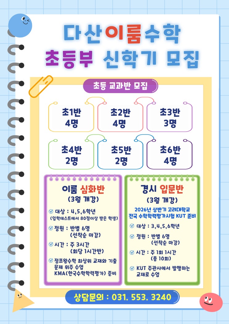 초등 수학은 단순히 연산만 잘하면 되는 과목이 아닙니다. 이 시기는 개념을 얼마나 정확하게 이해하고 있는지가 가장 중요합니다. 개념 이해가 정확하게 된 아이들은 문제를 읽고 해석하는데 다양하게 접근을 하기도 합니다. 수학은 초등부터 고등까지 사슬처럼 연결이 되어 있어 있습니다. 그래서 수학 개념이 탄탄하게 잡혀있어야 학년이 올라가도 흔들리지 않습니다. 이번에 심화반 모집은 개념을 토대로 심화 학습 및 아이의 사고력, 집중력, 고난도 문제 해결 능력 강화를 목표로 하고 있으며 나아가 아이들의 실력을 확인할수 있는 경시대회도 준비하고 있습니다. 자세한 내용이 궁금하시면 학원으로 문의 주세요~ <img src="https://blogthumb.pstatic.net/MjAyNjAyMjNfMjAy/MDAxNzcxODI1NTI5NjA4.7GFSaP1NWanL713o81dw0BNoH_LLrPdhutOGB_1SWKgg.HnCOapwOYSCqkHBLKio16X6C1DqXRruYN5mjdFkN4rQg.JPEG/A4-%C3%CA%B5%EE%B8%F0%C1%FD%C8%AB%BA%B8%C1%F6.jpg?type=s3" />