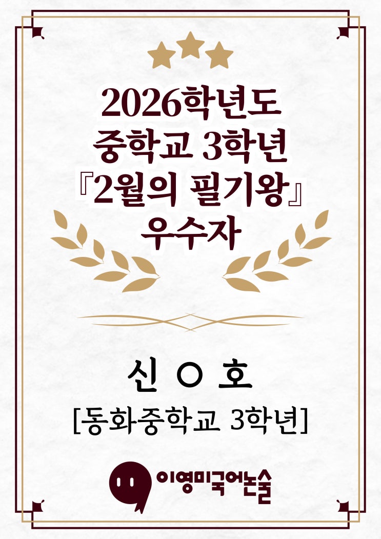 2026년 중등 2월의 필기왕 수업 열심히 듣게 하는 동기부여 프로젝트 '이달의 필기왕' 2월 수업 열심히 듣고 필기 한 학생에게 주는 '필기 왕' 정기적인 행사를 실시했습니다. (부상과 함께 시상했습니다.) 매 순간 열심히 공부하는 울 영미피플 항상 응원합니다. '2월 필기 왕'에 선정된 학생 사랑을 듬뿍 담아 축하합니다^^ 동화중학교 3학년 신O호 다산한강중학교 2학년 김O윤 퇴계원중학교 1학년 홍O희 축하합니다^^♥ 앞으로도 학생들의 성장을 세심하게 돕는 수업과 관리를 이어가겠습니다. 기타 문의는 학원 대표번호로 부탁드립니다. 감사합니다. <img src="https://blogthumb.pstatic.net/MjAyNjAzMTVfMTUx/MDAxNzczNTczMjQxNjQ0.BlkquJpxa3rXJ8LOa3hidgug7fZMu3S7_DKiaHuGBawg.dCrovpowbsgNGwaRlD4nC_DO6jqUwOhEIZXb2XpilfQg.JPEG/%BD%C5%B9%CE%C8%A3.jpg?type=s3" />
