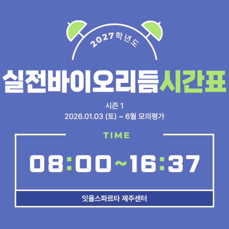 안녕하세요 잇올 스파르타 제주센터입니다. 지난주 토요일을 시작으로, 매주 토요일! 2027학년도 실전바이오리듬 시즌 1 시간표가 운영되고 있습니다! 잇올 출신의 수많은 명문대 선배들이 극찬하는 잇올 시스템 중 하나인 실전바이오리듬은 학습 시간표를 실제 수능과 동일하게 변경하여 훈련하는 프로젝트입니다! ⏰실바 운영시간⏰ 0교시 08:00-08:30 1교시 08:40-10:00 2교시 10:30-12:10 점심시간 12:10-13:10 3교시 13:10-14:20 4교시 14:50-16:37 5교시 16:50-18:00 저녁시간 18:00-19:10 6교시 19:10-20:40 (자율) 7교시 20:55-21:50 (자율) 8교시 22:00-22:50 (자율) 실바 시즌1 운영기간 실전바이오리듬 시즌1 시간표는 2026.0....... <img src="https://blogthumb.pstatic.net/MjAyNjAxMTBfNjkg/MDAxNzY4MDEwMjM1MzY0.j_NwHwv7yo8wM3062SwIZLeRy348ibMQDSGA52bDDs0g.jiumOrHI3YYYhBNUTcx_D0k4j31Lep1ubi3YtuHim1sg.PNG/%BD%C7%B9%D9.png?type=s3" />