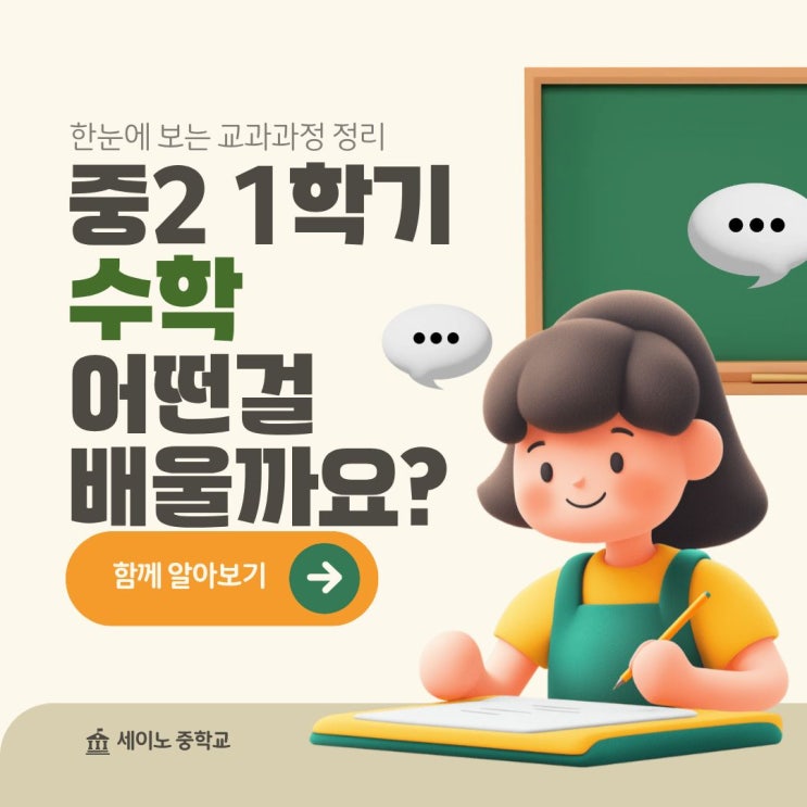 안녕하세요 동탄 수학학원 세이노 입니다! 중학교 수학은 초등 수학과 달리 ‘계산’보다 ‘개념의 연결’이 아주 중요해지는 시기인데요! 새로운 개념을 무작정 늘리기보다, 중1에서 배운 개념을 ‘도구’처럼 쓰는 단계입니다. 오늘은 중2 1학기 수학 교과정을 단원별로 무엇을 배우고, 왜 중요한지 차근차근 살펴보겠습니다! Ⅰ. 수와 식 : 중1 계산을 ‘기본기’에서 ‘활용 단계’ 1. 유리수와 순환소수 ▪ 유리수와 순환소수의 표현 중2에서는 단순히 순환소수 = 유리수 를 아는 것을 넘어, 왜 그런지 설명할 수 있어야 합니다. 유한소수와 순환소수의 차이와 분수 ↔ 소수의 자유로운 변환수 체계에 대한 이해도 필수죠 ▪ 순환소수....... <img src="https://blogthumb.pstatic.net/MjAyNTEyMTRfNzMg/MDAxNzY1NjkwMDI1MjQ1.3nzcLC21WwSGHjfxtmKboNFiTK--EjEyNLkgTbot14Eg.q7gPN-W4UTgAVl-Sgd7oXtNo-HhdRKsUjiYtp72kmO0g.JPEG/%C1%A6%B8%F1%C0%BB_%C0%D4%B7%C2%C7%D8%C1%D6%BC%BC%BF%E4._%2829%29.jpg?type=s3" />