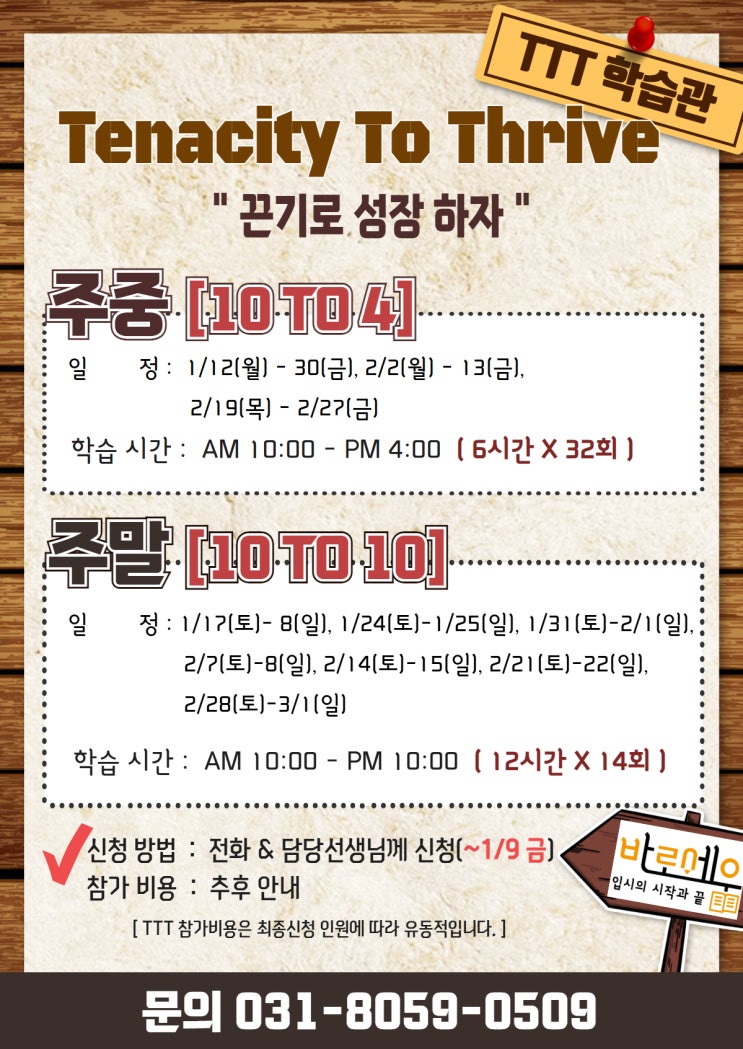 겨울방학, 늘어지기 쉬운 시간일수록 ‘관리된 학습’이 필요합니다 방학이 되면 아이들은 잠은 늦어지고, 계획은 흐트러지기 쉽습니다. 하지만 겨울방학은 새 학년을 준비할 수 있는 가장 중요한 골든타임입니다. 바로세움학원은 이 시간을 그냥 흘려보내지 않도록 TTT학습관을 운영합니다. Tenacity To Thrive TTT학습관은 단순히 오래 앉아 있는 공부가 아닌, ✔ 정해진 시간 ✔ 체계적인 관리 ✔ 끝까지 해내는 학습 태도 를 통해 학생 스스로 공부의 힘을 기를 수 있도록 돕습니다. ✅ 이런 학생에게 추천합니다 방학만 되면 생활 패턴이 무너지는 학생 혼자 공부하려다 작심삼일로 끝나는 학생 새 학년을 앞두고 기초부터 차근차근 정리하....... <img src="https://blogthumb.pstatic.net/MjAyNjAxMDdfMSAg/MDAxNzY3NzY3ODE2NzAw.nXCyB4ehv_VOB50TyJeBgAxQ7osIr0nvA4Q7bnhfUiYg.hfgtLHnfTXYR83o2-gOOzG034gd9Tnk0lDQGTOaPKjkg.JPEG/TTT%28%B0%DC%BF%EF%29%B9%E6%C7%D0.jpg?type=s3" />