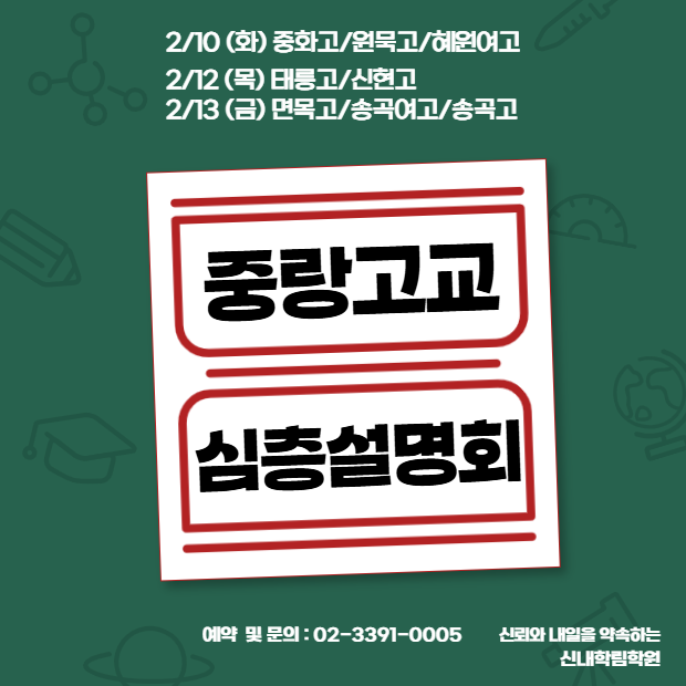 중랑구 고등학교별 특징 및 과목별 공부방법에 대해 2026 대입 수시 'SKY 12명 합격'을 배출한 신내학림학원에서 기초부터 탄탄하게!! 알려드립니다. ▶ 2/10 (화) 17:30-19:00 중화고 19:00-20:30 원묵고 20:30-22:00 혜원여고 ▶ 2/12 (목) 18:00-19:30 태릉고 19:30-21:00 신현고 ▶ 2/13 (목) 17:30-19:00 면목고 19:00-20:30 송곡여고 20:30-22:00 송곡고 ▶ 대상 : 중랑구 2026 고1 학부모/학생 ▶ 장소 : 신아타운 9층 신내학림학원 3관 세미나실 ▶ 문자 예약 및 문의 : 010-8280-3658(학교.학생명.학부모연락처) / 02-3391-0005 <img src="https://blogthumb.pstatic.net/MjAyNjAyMDdfOCAg/MDAxNzcwNDYyMjYxNTEx.F3al6PqONSLIf2k8rdGLTnh0xp-5CqAXYle9-Vj3NcAg.XGBnMnOKs8yAJjHoy33ngF8C_hT2jnVcMmo1W2TNTyAg.PNG/image.png?type=s3" />