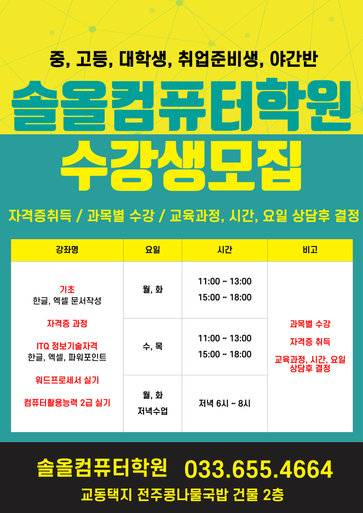 강릉 교동택지 솔/올/컴/퓨/터/학/원 2026년 상반기 수강생 모집합니다. 교육과정, 시간, 요일은 상담후 진행됩니다. 상시 모집이 많은 관계로 학원 수업 관련 문의는 전화상담 / 방문상담해 주시면 빠르게 상담 도와드리겠습니다. :) " 방문상담시 상담예약전화 부탁드립니다." 수업중에는 전화통화가 힘드실수 있습니다. 기다려주시면 연락드리겠습니다. * 교동택지 구름다리옆 전주콩나물국밥 건물 2층* * 상담문의 033-655-4664 * <img src="https://blogthumb.pstatic.net/MjAyNjAyMTlfMzAg/MDAxNzcxNDc1MDkxNTkx.4ZS8nEgvHHkOGs0OdWm_y0NQ0dWBtptOfJGWCCBtVY8g.oC0wmou0lwiycH3obkxvE8dv4b9tWkyKFHrn-gsk8AIg.PNG/%C1%A6%B8%F1%C0%BB_%C0%D4%B7%C2%C7%D8%C1%D6%BC%BC%BF%E4._%281%29.png?type=s3" />