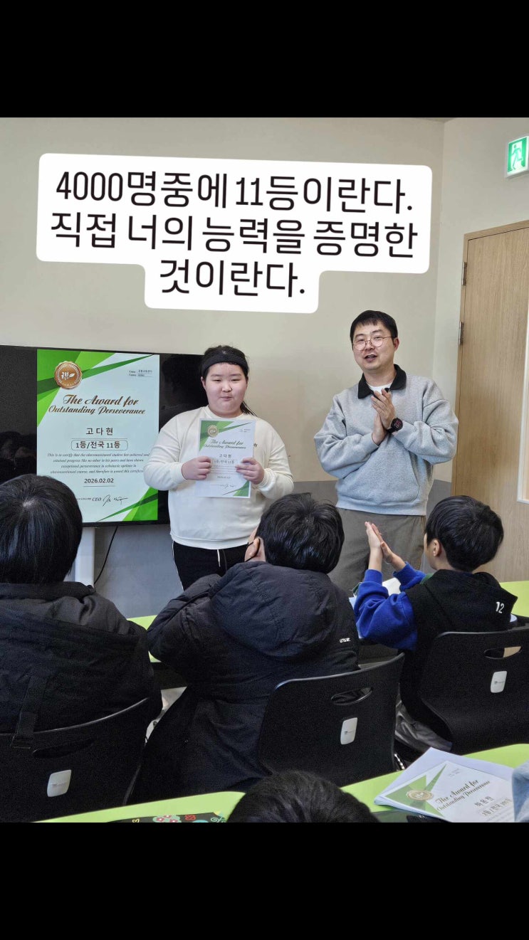 4000명중에서 11등은 그렇게 중요하지 않단다. 니가 노력한 그 과정이 훨씬 더 중요하단다. 남보다 2배의 노력을 기울여서 노력했다는 점이 너를 더 크게 성장시켜줄꺼야. 그리고 지금 친구들 앞에서 박수를 받는 이 기억이 너에게 정말 큰 시작점이 될 것이란다. 이건 단순히 상장이 아니라, 처음으로 느껴보는 성취감이라는 것이란다. 이제 곧 더 큰 것을 해내고 싶은 욕심이 생길 것이고, 너 다시 한번 더 열심히 뛰어가게 될 것이란다. 그래서 지금 이 순간이 너에게는 시작점이란다. 공부가 중요한 것은 맞지만, 니가 작게라도 성장해나가는 그 경험이 어느 누구의 말보다 훨씬 더 강력할 것이란다. 사랑하는 우리 공터친구들이 꼭 이런 경....... <img src="https://phinf.pstatic.net/image.nmv/blog_2026_02_17_814/EprCc1un9W_03.jpg?type=f480x480" />