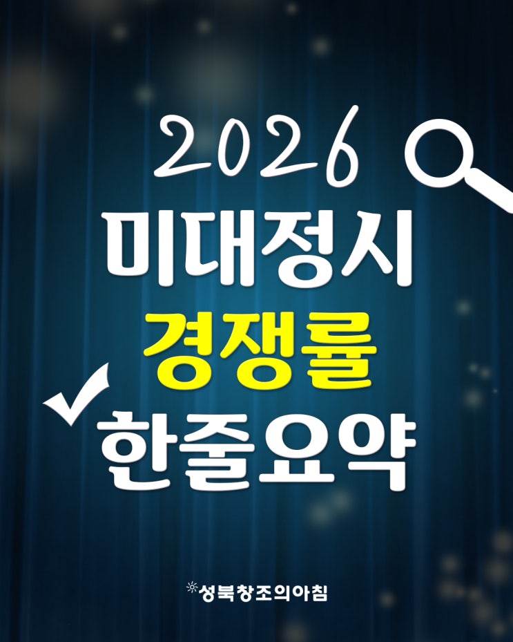 안녕하세요. 성북창조의아침 미술학원입니다. 얼마 전 2026학년도 정시 접수가 끝이 났습니다. 유웨이어플라이 파워 경쟁률을 근거로 이번 2026학년도 미술대학교 정시 최종 경쟁률을 요약해 보았습니다. 경쟁률 참고하시고 자신이 원서접수한 곳은 어느 정도의 경쟁률을 가지고 있는지 확인해 보면 될 것 같습니다. 2026 미대 정시 경쟁률 한 줄 요약 가군에 위치한 고려대학교 디자인조형학부 경쟁률부터 알아보겠습니다. 디자인조형학부는 6.51:1의 경쟁률을 보였습니다. 고려대는 실기가 정시에 반영되는 학교로 비중은 30%입니다. 숙명여대는 시각영상디자인 2.89:1, 산업디자인 3.38:1, 환경디자인 5.40:1, 공예과는 6.09:1입니다. 2026 서....... <img src="https://blogthumb.pstatic.net/MjAyNjAxMDJfMjA2/MDAxNzY3MzQ4OTk5MzM4.QfoVJHR9oVdaMH0gVuKcEFtz5C7ret1jx0W4bjfk37cg.LBGWJcxP-Gla5kCgQ_Z03EBqUYx2mWJ_R1BmT6Q315Mg.JPEG/2026-%C1%A4%BD%C3-%B0%E6%C0%EF%B7%FC.jpg?type=s3" />