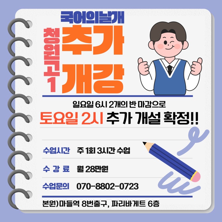 안녕하세요, 국어의 날개입니다. 1학년 수업 시간표가 확정되어 안내드린 후 학부모님들의 관심과 응원에 깊이 감사드립니다. 청원고 1학년 일요일 6시 2개반이 모두 마감되어 [토요일 2시 수업] 추가 개설을 확정하였습니다!!! 추가 개설 소식과 함께 내신 대비도 안내드립니다. * 2월까지는 예비고1 수업으로 진행이 되며, 해당 시간표는 3월1일부터 시작이 됩니다. * 내신 대비 전까지는 모의고사 수업을 진행합니다. 수업 예약 및 상담 070-8802-0723 본관 동일로 1545, 현대골드시티 6층 (마들역 8번출구, 파리바게트건물) <img src="https://blogthumb.pstatic.net/MjAyNjAyMTNfMTkg/MDAxNzcwOTc4MTYxMjg0.X-hro-F2B1rQpTtnw03H6NvqZXxEgd8uBJ1_xlnBCa0g.gOP3tfsjFRIHEbp380jO04nJM3TZ798r-5e5Acic_6gg.JPEG/%C3%BB%BF%F81_%C3%DF%B0%A1%B0%B3%B0%AD.jpg?type=s3" />