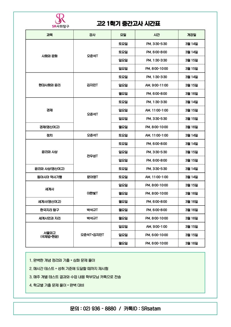 안녕하세요^^ SR사회탐구학원 입니다~~ 고2 사회탐구 1학기 중간고사 내신대비 과목별 시간표가 확정되어 안내 드립니다~~ 1학기 중간고사 시간표 완벽한 개념 정리와 기출+심화 문제풀이 매시간 테스트+성취 기준에 도달할 때까지 재시험 매주 개별 테스트 결과와 수업 내용 학부모님께 카톡으로 전송 학교별 기출 문제풀이+완벽대비 수강신청&문의 SR의 모든 강좌는 선착순 마감되니 서둘러주세요~~ 02-936-8880 [내선 2번 사탐] 카카오톡 문의가능 (SRsatam) 사탐수업은 SR수능관에서 진행됩니다^^ <img src="https://blogthumb.pstatic.net/MjAyNjAyMTZfMTQ0/MDAxNzcxMjQwMDYzMjcy.Ln0P_LqqBuy0ZjAaicNg2_g_mjbvdzz3OHuAwqiPSUcg.uOdp8S3GGXutq-73N_fhOtM2lZrxfNXCHrobti5Yd28g.JPEG/%BB%E7%C5%BD_%B0%ED2_1%C7%D0%B1%E2.jpg?type=s3" />