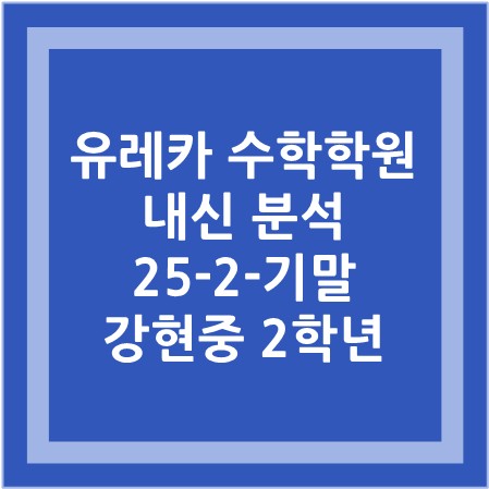 ※ 대상 : 강현중 2학년 ※시험범위 : 피타고라스 ~ 확률 전체적인 쉽게 출제 딱 교과서 수준으로 변별력은 높지 않아 최소 90점은 나와야 하는 난도 ※ 시험 준비 이번 강현중 2학년 2학기 기말고사 시험범위는 피타고라스와 확률 이번 시험은 시험 범위가 매우 좁고 학생들이 많이 어려워하는 확률 파트가 포함 확률은 문제 파악이 매우 중요한 파트 특히 확률은 다양한 문제를 풀어보면서 문제 이해를 잘했는지? 케이스 분리 및 경우의 수를 잘 구하는지? 이런 점들을 중점적으로 학습 확률은 문제 파악이 매우 중요한 파트 고난도 문제를 많이 풀어보면서 복잡한 문제의 이해를 많이 연습 ※ 시험 결과 강현중 기말고사는 전체적으로 교과서....... <img src="https://blogthumb.pstatic.net/MjAyNTEyMTZfMjQ2/MDAxNzY1ODgzMTEzMTg3.Zq3QW4WoAu2RRoXgDrD40wwsmgdi6h_1ETerkZ0S2owg.4rAzuOyYjssX4SO8n1_1yghwqFhaInA1LCtBcuYkysAg.JPEG/%B1%D7%B8%B202.jpg?type=s3" />
