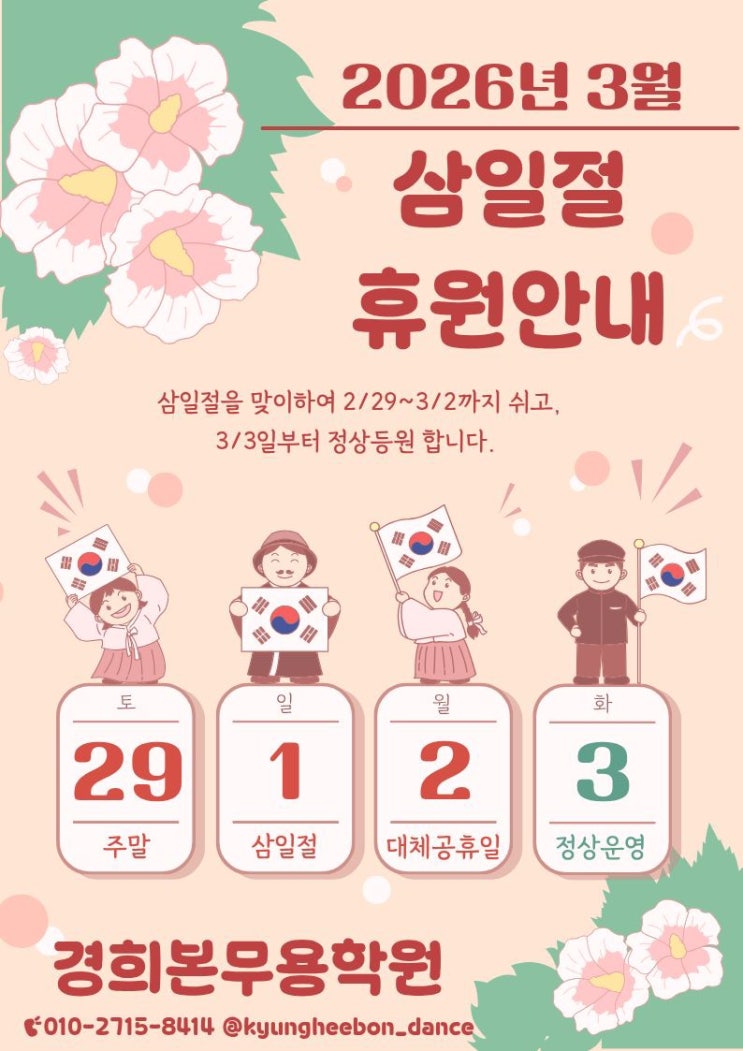 안녕하세요, 경희본무용학원입니다:) 즐거운 설 연휴 보내셨나요~? 긴 연휴가 지나고 또 휴원 안내를 드립니다 삼일절 대체휴일로 3/2(월) 휴원입니다 해당 수업일은 자동 이월될 예정입니다❤️ 일정에 참고부탁드립니다 또한 새학기를 맞이하여 새로운 시간표와 커리큘럼도 차근차근 안내드리겠습니다 ☺️ 위 휴원 일자 다시 한 번 참고부탁드리며, 3월 4일(화)에 뵙겠습니다 감사합니다 <img src="https://blogthumb.pstatic.net/MjAyNjAyMjNfMyAg/MDAxNzcxODE1MTI2MzIx.Z3HIWp2Ek2_Ufr2DifDUpfeO-TDGNeHxnhh7D1hSMowg.P3NS142OteXztztxdtZCnShgApMyOPifR2GbH-KsyXkg.JPEG/IMG%A3%DF8107.JPG?type=s3" />