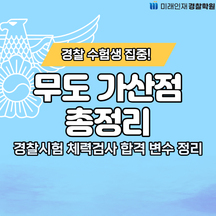 안녕하세요! 미래인재경찰학원입니다. 지난 번 알아본 순환식 체력검사에 무도 가산점이 포함되는 것 알고계신가요? 오늘은 무도 가산점 개편안부터 체력검사와 무도 가산점의 연관 관계 등 무도 가산점에 대해 정리해보겠습니다! 2026년부터 경찰공무원 시험에서 순환식 체력검사가 전면 도입되면서 경찰 체력시험 기준, 평가 방식, 무도 가산점 영향까지 모두 달라졌습니다. 이번 글에서는 ✔️ 경찰공무원 체력검사 기준 ✔️ 순환식 체력시험 핵심 구조 ✔️ 무도 가산점 영향 합격에 직접 영향을 주는 요소만 정리해드리겠습니다. 01. 무도 가산점 왜 필수인가 경찰공무원 체력검사 핵심 변화 ✔️ 기존 : 종목별 점수....... <img src="https://blogthumb.pstatic.net/MjAyNjA0MDZfNjMg/MDAxNzc1NDQyNzQ2MDkw.YqzbpVJxwTY5wVJeG_W82RCSdfvMrO7YQthM7iF-kFMg.MAtrrrsokov21e2BCuj29OmHj8_Qqqr4TieYOEwNs-cg.PNG/%BA%ED%B7%CE%B1%D7%BF%EB_%BD%E6%B3%D7%C0%CF%281_1%29_%2814%29.png?type=s3" />