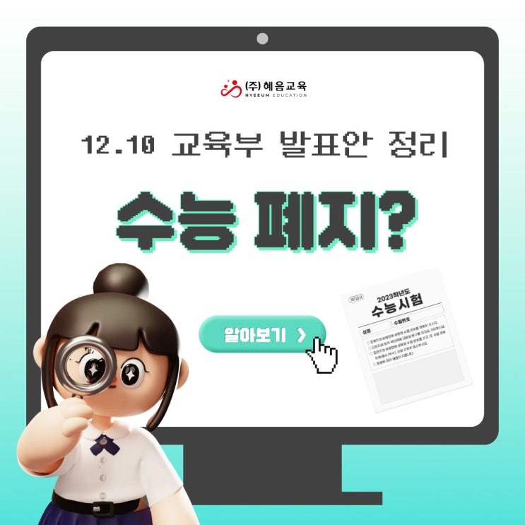 “정답을 고르는 시대에서, 생각을 쓰는 시대로” 안녕하세요, 혜음교육 EiE입니다 지난 12월 10일, 교육부에서 발표한 미래형 대입제도 개편안이 많은 주목을 받았습니다. 이번 발표는 단순한 시험 방식의 변화가 아니라, 우리 아이들이 앞으로 어떤 능력을 갖춰야 하는지를 명확히 보여주는 교육 방향성의 전환이라 할 수 있습니다. "2040학년도 수능 폐지"…정근식 "현 5학년부터 수능 절대평가, 서·논술형 도입" - 아시아경제 변화 1. 2028학년도부터 적용 (현재 고1, 2009년생) 수능 비중 축소 + 정성평가 강화 주요 대학의 정시 선발 비율을 줄이고 수능 위주 선발 기준을 폐지하는 방향 이는 점수 중....... <img src="https://blogthumb.pstatic.net/MjAyNTEyMTRfMTU1/MDAxNzY1NzE5NjA3MTI3.-sT9FNpyDYnFE5EBo0mABk2bwUKt8qHdM3EXjkJ2ZkQg.5znK19zaar1ax4lJxSMDJZMeIgFwIFKZNASWmeFIsgsg.JPEG/%C1%A6%B8%F1%C0%BB_%C0%D4%B7%C2%C7%D8%C1%D6%BC%BC%BF%E4..jpg?type=s3" />