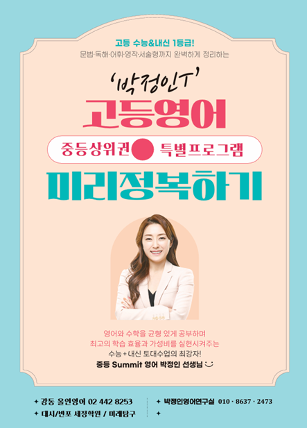 "상위권 고등영어 선점!! 고등영어 미리 정복하기" 최고의 학습 효율과 가성비를 실현시켜주는 수능+내신 토대 수업의 최강자 박정인T "대치.서초.강동 예비중3 최상위반 동시 개강" 대치.서초 .강동 예비중3영어!! 예비고1 수업 300여명 동시 수강 강사!! ▶수업 대상: ★중학영어 기본이 잡혀있는 학생 ★고등영어 1등급을 목표로 하는 학생 ★예비중3 겨울방학에 고등영어문법&어휘&서술형을 빡쎄게 트레이닝 하고 싶은 학생 ▶개강:1월14일(수) ▶수업일정: 월.수:10시~12시30(주2회반/클리닉 필수) ※ 레벨테스트는 필수사항입니다 ☎문의 02-442-8253 <img src="https://blogthumb.pstatic.net/MjAyNTEyMTlfMjQg/MDAxNzY2MTI4Nzc4MjU0.6J_Iik_dsYaE1B7h1lG8bCqCNIKVss5tc84NH6X3suAg.Ld3URPs_CbjActVbrfGT0uVy2RwXwu5QKvBtwrAFdvgg.PNG/1.png?type=s3" />