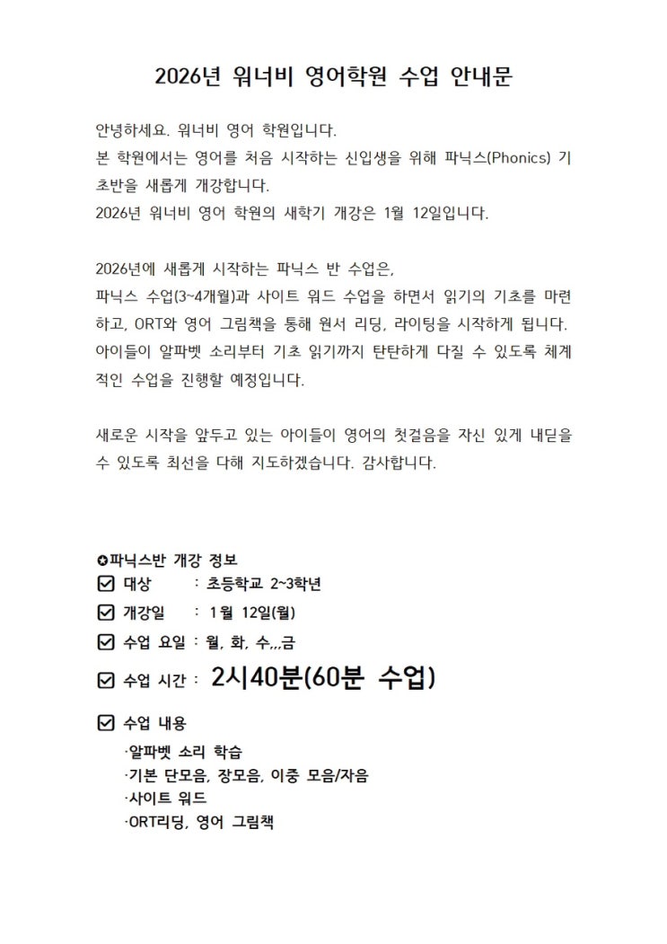 뮤엠영어힘쎈수학 1월 겨울방학 (상가 연합 방학) 안내 드립니다. 안녕하세요! 우리 아이들의 성장을 함께 고민하는 뮤엠영어힘쎈수학입니다. 어느덧 추운 겨울이 깊어지고 있습니다. 1월을 맞아 우리 아이들이 에너지를 재충전하고, 새 학기 도약을 준비할 수 있도록 짧은 겨울방학을 가지고자 합니다. 이번 방학은 상가 내 학원 연합 동시 방학으로 결정되어, 상가 내 타 학원 일정과 동일하게 진행됩니다. 학부모님께서는 아래 일정을 확인하시어 아이들의 학습 스케줄에 차질 없으시길 바랍니다. 방학 기간: 2026년 1월 12일(월) ~ 1월 13일(화) 등원일: 1월 14일(수) 오후부터 정상 수업 * 1월 9일(금) 국사과수업 휴강 방학 기간 중에는 전....... <img src="https://blogthumb.pstatic.net/MjAyNTEyMjlfNTQg/MDAxNzY2OTkxNzk2MzI2.vpxtJPupOq7yo5F1Vp4uuy2ssInL5xtFcbxg2b5Yz3kg.pY8o_M1wWhupcWdVfMVoeSTa7G-4DV_kldzUJmjDaUUg.PNG/image.png?type=s3" />