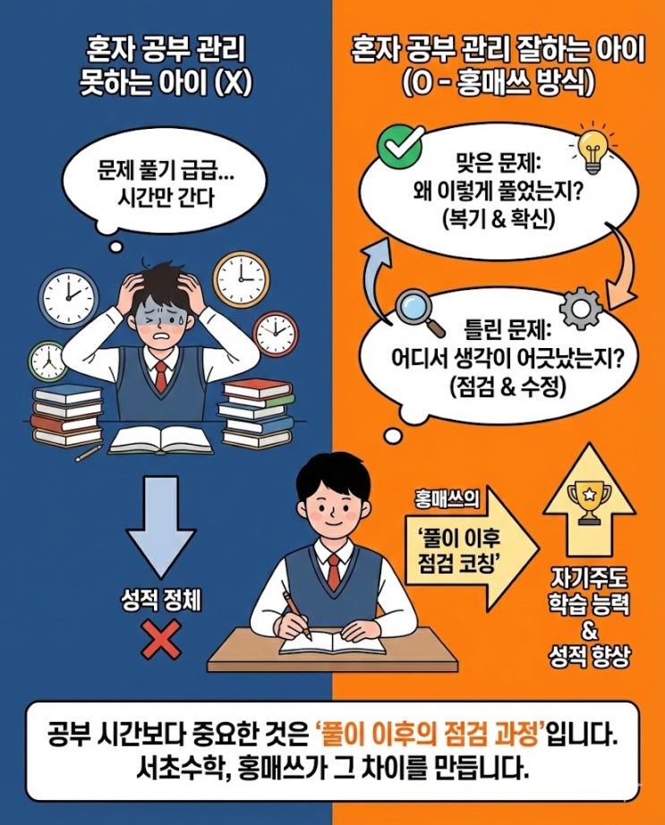 안녕하세요. 본질에 충실하면서도, 철저한 체계 아래 실력을 길러주는 홍매쓰수학학원 서초점입니다. 수학은 혼자 앉아서 해결해야 하는 시간이 많은 과목입니다. 그래서 학부모 상담에서 “우리 아이는 혼자 공부는 잘해요”라는 말을 자주 듣습니다. 하지만 실제로 성적까지 안정적으로 이어지는 경우는 생각보다 많지 않습니다. 같은 시간을 혼자 공부해도 누군가는 실력이 쌓이고, 누군가는 제자리에 머무는 이유는 분명합니다. 수학에서 말하는 혼자 공부는 단순히 문제를 많이 푸는 것을 의미하지 않기 때문입니다. 혼자 공부를 ‘관리’할 수 있는 아이는 다릅니다 서초수학학원, 홍매쓰수학학원에서 학생들을 지도하다 보면 혼자 공부를....... <img src="https://blogthumb.pstatic.net/MjAyNjAyMjNfMjEg/MDAxNzcxODI4Mzk5Nzg5.RwM1Ucb675S1Mbvmt408BEEUEYHz9CLI6Mt25dNdW4sg.0qX-LhsThW3wrtfo3_gKzkgjBUrQsW_kpKgP1Zn7074g.JPEG/unnamed.jpg?type=s3" />