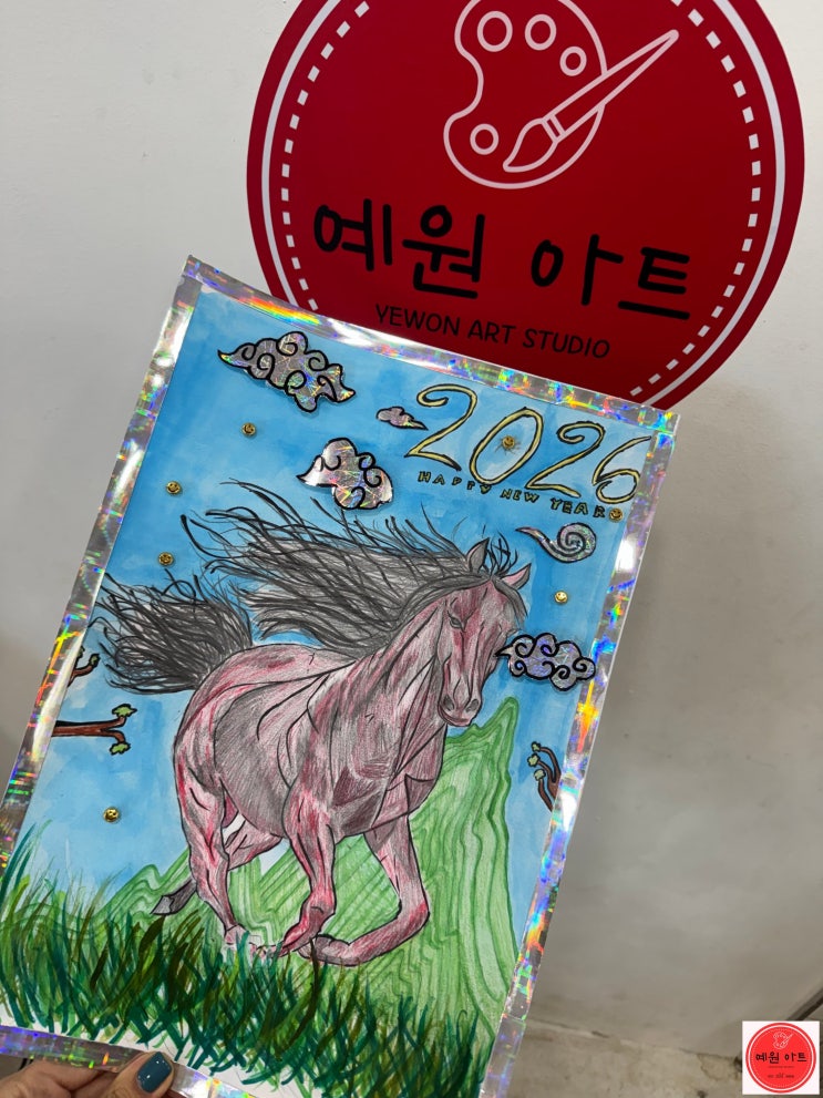 안녕하세요.예원아트 입니다. 2026년 1월 2026년 병오년(丙午年) 붉은 말 띠의 해 주제로 작업해준 남아친구의 작품을 포스팅 해보도록 하겠습니다. 영국에서 살다온 친구라고 하네요. 혼자서 그림을 그리고 연습해 봤지, 학원을 다녀본적은 처음이라고 합니다. 그림을 혼자 꾸준히 그려본 친구라 그런지, 어느정도의 형태력은 있네요! 전체적인 말의 위치를 선정해주고, 말의 근육 구조와 움직임을 이해하며 형태를 잡아가고 있어요. 수채화를 이용하여, 배경을 칠해주고 있어요. 배경의 튀지 않게 차분히 눌러주는 느낌으로 칠해보자고 했어요. 초등 고학년답게 화면 구성과 집중력이 돋보이며 멋지게 작업해주는 작가님 입니다. 세필 붓을 이....... <img src="https://blogthumb.pstatic.net/MjAyNjAyMDNfMjEy/MDAxNzcwMTAwNzc2MDMx.v3WfGd2JuG_PtNKKDovfyMnlWjvTveYU-rv1xVeIg7Ig.zk9aL67kYe10KA7ay4pgXqjYQZ4xg_SExvfnipVD8akg.JPEG/KakaoTalk_20260127_141030972_03.jpg?type=s3" />