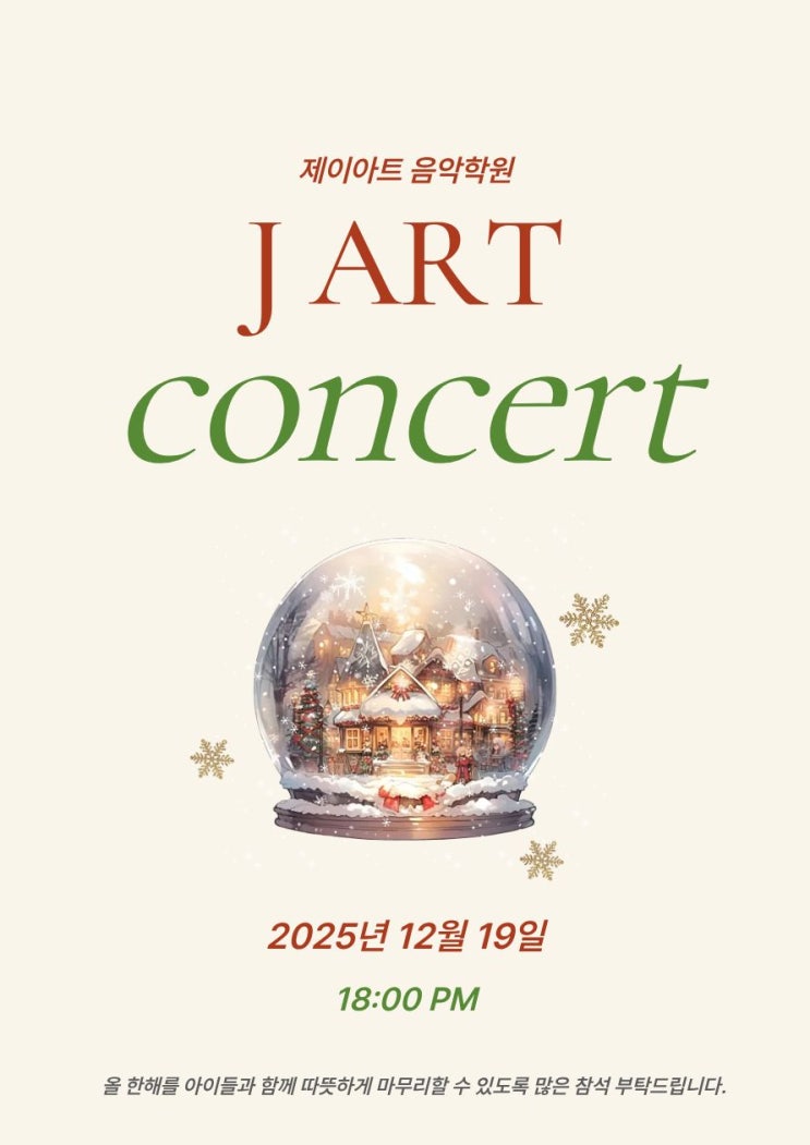 안녕하세요! 지난 12월 19일 저희 제이아트 음악학원에서는 정기연주회가 열렸습니다. 이번 연주회에는 총 35명의 아이들이 무대에 올라 그동안 열심히 연습해 온 곡들을 정말 훌륭하게 연주해 주었어요! 무대 위에서 집중하는 아이들의 모습 하나하나가 정말 대견하고 감동적인 시간이었습니다. 특히 이번 연주회는 많은 학부모님들께서 함께해 주셔서 아이들에게 더욱 의미 있는 추억이 되었던 것 같아요. 따뜻한 박수와 응원이 아이들에게 큰 힘이 되었을 거라 생각합니다. 무대에 서기까지 보이지 않는 곳에서 매일같이 성실하게 연습해 준 아이들, 그리고 아이들 한 명 한 명을 세심하게 지도해 주신 선생님들 덕분에 이번 정기연주회를 잘....... <img src="https://blogthumb.pstatic.net/MjAyNTEyMzBfMTcy/MDAxNzY3MDg1NTI5NTE3.pa0J0iOEFtSUeUoZxgBJsXtVQauPhBs5cGooTP7DWx8g.oU8NyNNqCvHOkiCsqTrvIawr4450-_HR4WAO2Xb1Anog.JPEG/2025_%C1%A4%B1%E2%BF%AC%C1%D6%C8%B8.jpg?type=s3" />