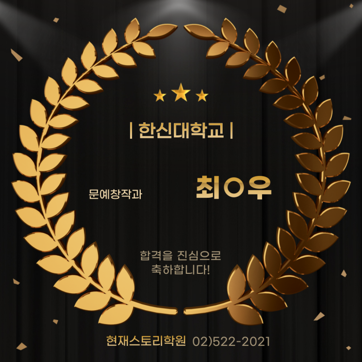 안녕하세요, 문창과, 극작과, 웹소설과, 영화과 입시 전문 현재스토리학원입니다. 오늘은 여러분들께 정말 기쁜 소식을 전해드리려고 합니다! 한신대 합격을 축하합니다! _ 현재스토리학원 한신대학교 정시에서 현재스토리학원 학생이 최종 합격을 했습니다~! 한신대학교 합격! 최OO 학생 진심으로 합격을 축하합니다! 한신대학교 합격을 진심으로 축하합니다! 글쓰기에 대한 기초 이론을 탄탄하게 다졌으니 앞으로는 쓰고 싶은 작품을 마음껏 쓰시기를 바라요! 원하는 꿈을 이루시는 날까지, 현재스토리학원이 응원하겠습니다. 다시 한 번 합격을 진심으로 축하합니다! ※ 한신대학교 최종 합격 이후로도 현재스토리학원 학생들의 합격 소식은 계....... <img src="https://blogthumb.pstatic.net/MjAyNjAyMDhfMTI0/MDAxNzcwNTI5MDAzMTk5.xjz-g1Tx8KEyn9QiYzuOjAM8rbKVGd6QOA1Lb-s349Qg.Rxn0N6cUshz1F8j_k4FjITe5--Ip0L0it_T5xCTGBiUg.PNG/2026-%C7%D5%B0%DD-013.png?type=s3" />