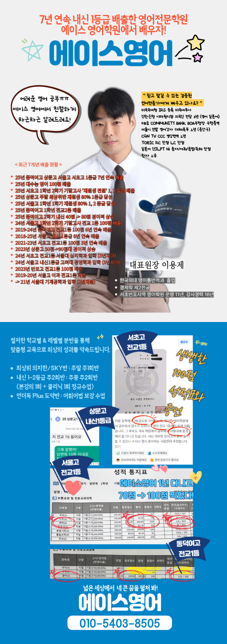 안녕하세요! 에이스영어입니다 2학년 1학기 시간표를 안내드립니다. 작년 에이스영어 학생들은 2학기 지필고사를 치룬 후 괄목할만한 성적향상을 경험하였습니다. 올해도 그 놀라운 성적향상을 함께 이뤄가겠습니다. 빠른 시간표 확인 스스로 과제 관리가 가능하고 과제 학습 속도가 빠른 내신 성적표 기준 상위 20% 이내 학생들은 주1회 수업 신청이 가능합니다. Q1. 레벨별 분반은 어떻게 나뉘나요? 1) 정규반은 상위 10-40% 레벨의 학생들의 눈높이에 맞춘 1-2등급 달성 목표의 주2회 수업입니다. 학교&학년별 분반입니다. 2) 고2 상위반은 내신 성적표 기준 상위 20% 레벨의 학생들만 입반 가능한 전교권 경쟁을 위한 주1회반입니다. 압....... <img src="https://blogthumb.pstatic.net/MjAyNjAyMTBfMjIg/MDAxNzcwNjk2MDYwODE0.WRtskE-JOAoZGd52V8Bu3Jlwu5kMnRs5n_sFiYAqIuAg.U8JIgNIYKk-ybx0WTun1V1ifxn4d1TRK-EZj_4EDLmAg.PNG/%BF%A1%C0%CC%BD%BA%BF%B5%BE%EE_%BC%AD%BF%EF%B0%ED_%BB%F3%B9%AE%B0%ED_%B5%BF%B4%F6%BF%A9%B0%ED_%BC%AD%C3%CA%B0%ED_%BF%B5%BE%EE_%B3%BB%BD%C5_%C7%D0%BF%F8_%BF%B5%BE%EE%B3%BB%BD%C5_%C7%D0%BF%F8_%BC%AD%C3%CA_%BA%BB%C1%A1%C7%D0%BF%F8_%BF%A1%C0%CC%BD%BA.png?type=s3" />