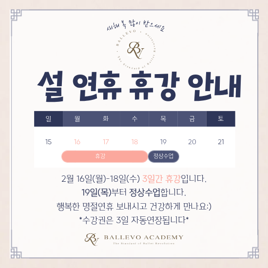 연휴 동안 지친 몸과 마음을 충분히 회복하시고, 더 가벼워진 몸으로 다시 만나 뵙기를 기대하겠습니다. 새해 복 많이 받으세요 (수강권은 자동연장되니 기다려주세요 ^^) <img src="https://blogthumb.pstatic.net/MjAyNjAyMTNfMjcx/MDAxNzcwOTY3MDAwNjMx.lvFXrxnppwjcMdpvDCP7fVroPbiu61cKJoOvZxVSIDog.nvzA6aGyEGWQdxs2mD8HN0o5AP-yiHQoJbiUm_NzOegg.PNG/%B8%ED%C0%FD%BF%AC%C8%DE%C8%DE%B0%AD%BE%C8%B3%BB.png?type=s3" />