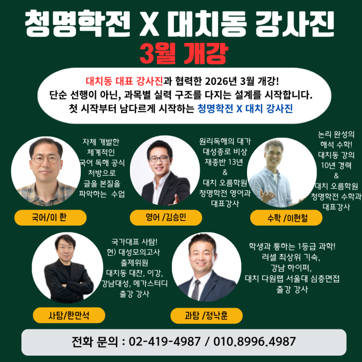 청명학전 3월 개강 방이동 국어학원 청명학전, 대치를 품다! 2026년 3월, 방이동 국어학원 청명학전과 프리미엄 대치 강사진이 여러분의 새로운 시작을 함께합니다. 방이동 국어학원 청명학전의 시간표 방이동 국어학원 청명학전 X 대치동 강사진은 효과적이고 효율적인 학습을 위해 언제나 최선을 다합니다. 결과를 증명하는 시작! 정답은 방이동 국어학원 청명학전 X 대치동 강사진입니다. 각 과목의 명장 선생님들을 방이동 국어학원 청명학전에서 만나보세요. <img src="https://blogthumb.pstatic.net/MjAyNjAyMTlfNjYg/MDAxNzcxNTA4NDQxOTM2.ByPqsegTuGOieZ3uN9SQBw3PcBdPjMylOCq4WrDXXa8g.nc7KLaQt1nLhMEanfzTohEYDEI2hr_Y37k_GkCXM9Zgg.PNG/%C6%C4%B6%F5%BB%F6_%B3%EB%B6%F5%BB%F6_%C7%D0%BF%F8_%B0%AD%BB%E7_%C0%D4%BD%C3_%C0%FC%B9%AE_%C0%CE%BD%BA%C5%B8%B1%D7%B7%A5_%B0%D4%BD%C3%B9%B0.png?type=s3" />