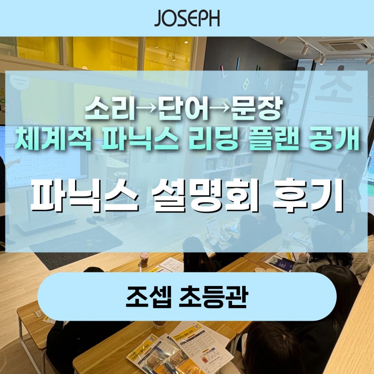 조셉 초등관 파닉스 설명회 안녕하세요. 독산동 · 금천구 영어학원 조셉초등관입니다. 조셉 초등관 라이브러리에서 파닉스 설명회 1회차가 진행되었습니다. 이번 설명회에서는 단순한 커리큘럼 안내를 넘어, ✔ 아이들의 학습 습관 형성 ✔ 초등 영어 교육의 방향성 ✔ 교육기관의 역할과 책임 ✔ 그리고 조셉만의 체계적인 파닉스 시스템 을 깊이 있게 공유하는 시간이었습니다. 소리 → 단어 → 문장으로 이어지는 체계적 학습 조셉 초등관의 파닉스는 단순히 알파벳 소리를 외우는 수업이 아닙니다. 소리 → 단어 → 문장으로 이어지는 구조적 학습입니다. 소리를 정확히 이해하고, 소리가 단어로 확장되며, 결국 문장 읽기로 연결되는 흐....... <img src="https://blogthumb.pstatic.net/MjAyNjAyMjBfMjE0/MDAxNzcxNTkxNzc0NzM3.i4LDluxfqlUp0sUqigXeZfEIzhMeGXCpxwDbcVgH-sIg.g3ByE0l7mQRWV4HiUGOin7_LhFirzmY5FlMCPMj-Bo8g.JPEG/001.jpg?type=s3" />