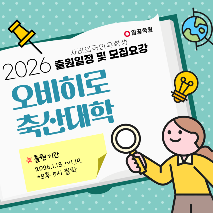 안녕하세요! 일본유학 공부하는 곳 일공학원의 영통 블로그 지기입니다! 이번엔 일본의 국립대학 중 하나인 오비히로축산대학의 출원 일정과 모집요강을 살펴볼게요! 오비히로축산대학 홈페이지 ※ 이미지를 클릭하면 원본 사이즈로 더 선명하게 확인 할 수 있습니다. 오비히로축산대학 모집요강 :: 출원기간 :: 2026년 1월 13일 (화) ~ 1월 19일 (월) *오후 5시 필착 :: 출원 가능 학부 :: 축산학부 축산과학과정 - 가축생산과학유닛 - 환경생태학유닛 - 식품과학유닛 - 농업경제학유닛 - 농업환경공학유닛 - 식물생산과학유닛 :: 필요 과목 :: 일본어 수2 이과 택2 :: 합격 발표일 :: 2026년 3월 6일 (금) 오전 10시 홈페이지 발표 오비히로축....... <img src="https://blogthumb.pstatic.net/MjAyNjAyMjRfMTkw/MDAxNzcxOTEzNjAzMzEw.L9vVSqrNBrx6eDO2Wq9HHRF0qoJbK8lkZtwz24jrSvcg.TNN25am7Mp4IzSdaHrEMytmWEykk8rSTJZMFo9cMkVIg.PNG/010.png?type=s3" />