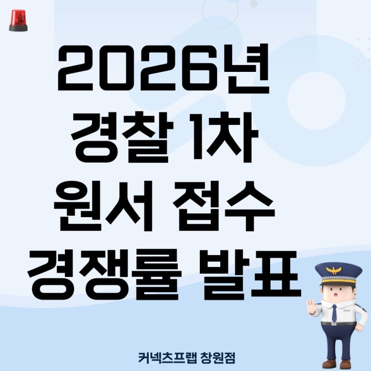 안녕하세요. 커넥츠프랩 창원점입니다. 2026 경찰 1차 공채 원서 접수가 끝나고 지역별 경쟁률이 발표 되었습니다. 대부분의 학생들이 많이 지원하는 부산 13:1 /경남 8.7:1 서울 8.7:1 / 경기 남부 6.8:1입니다. 올해부터 통합 채용 및 체력 변경으로 인해 혼란이 있으실텐데, 그럼에도 남은 기간 동안 마무리 잘하셔서 원하는 결과 꼭 이루시길 바랍니다! 자세한 내용은 아래의 첨부 파일 참고 부탁드립니다. 언제나 여러분을 응원합니다. 원활한 상담을 위해 예약 후 방문 부탁드립니다. 합성점 ☏ 055-252-0034 상남점 ☎ 055-262-0099 <img src="https://blogthumb.pstatic.net/MjAyNjAyMjBfMzYg/MDAxNzcxNTc2OTc3Nzkz.q4mTmBFxZcCwueLN-ZRiEv1VDDrbnuxrqL4hmJxbMHYg.kXcAVR2jRaua_tuEnAjKWoor_QekUHsErhuXD8qrcBEg.JPEG/%C1%A6%B8%F1%C0%BB-%C0%D4%B7%C2%C7%D8%C1%D6%BC%BC%BF%E4_-001_%285%29.jpg?type=s3" />