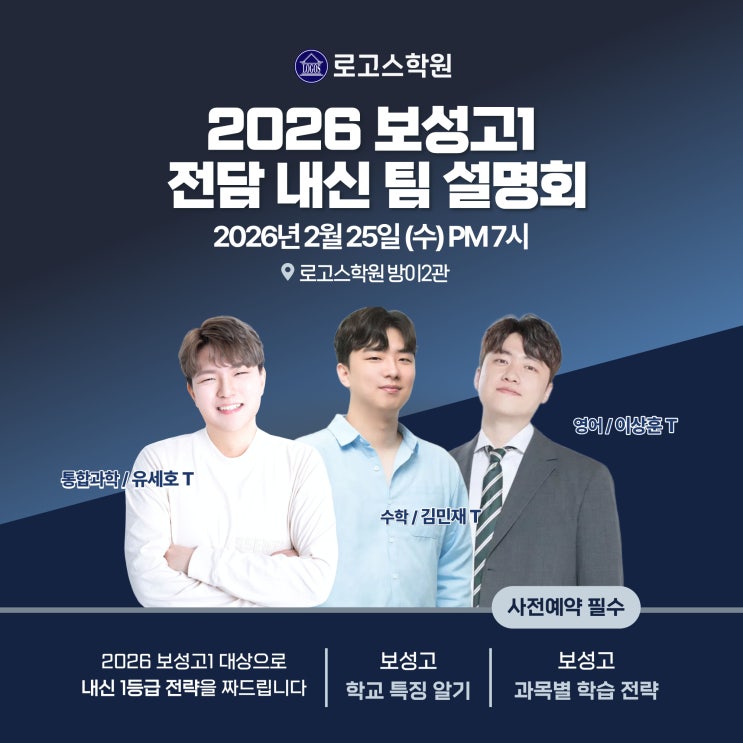 안녕하세요, 로고스학원 입니다. 2026 보성고1 학생들을 위한 통합과학, 수학, 영어, 통합사회 전담반이 개설되었습니다! 보성고의 학교, 내신 특징은 어떠한지, 과목별 학습 전략에 대해 알아가실 수 있는 보성고 전담 과학, 수학, 영어 선생님들과 함께하는 팀 설명회 안내드립니다. 로고스학원 설명회 신청을 원하시는 학부모님은 아래 내용을 필독하신 후 신청 부탁드리며, 신청 방법은 글 제일 하단에 있으니 확인 부탁드립니다. * 자리가 한정되어 반드시 사전 신청하셔야 합니다. 설명회 대상 ✔︎ 2026 보성고1 학생, 학부모님 보성고 설명회 내용 ✔︎ 보성고 학교 특징 알기 ✔︎ 보성고 과목별 학습 전략 보성고 설명회 상세 일정 및....... <img src="https://blogthumb.pstatic.net/MjAyNjAyMTlfMTAz/MDAxNzcxNDc4NjAwMzY4.BIqBVuV1coVcv7IjMRL0udT5QTdYAfp68rmrwyGfKaUg.tyHU2Ks6rBM6qsKKSarIA2Y4U4bjyXxY-jRKXcRPrmgg.JPEG/%BA%B8%BC%BA%B0%ED.jpeg?type=s3" />