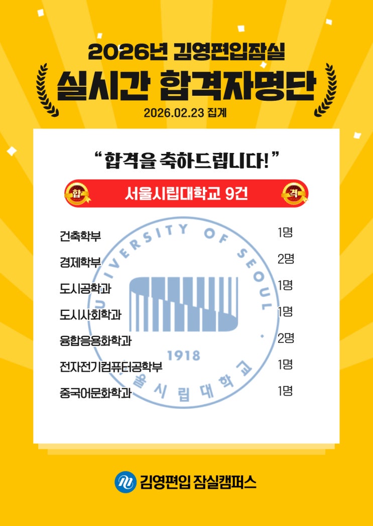 안녕하세요 잠실 강동 별내 위례 광진 천호 강남 송파 중랑 서초 구리 남양주 하남 김영편입 잠실캠퍼스 입니다. 2026학년도 편입학 전형에서 김영편입 잠실캠퍼스 수강생들이 서울시립대학교 '실시간 합격'으로 총 9건 합격하는 성과를 거두었습니다. 합격생 여러분 모두 축하드립니다 서울시립대학교 실시간 합격자(C:김영편입잠실) 서울시립대학교 실시간 합격 현황 (총 9건) 인문·사회계열 건축학부: 1명 경제학부 2명 중국어문화학과: 1명 자연·공학계열 도시공학과: 1명 도시사회학과: 1명 융합응용학과: 2명 전자전기컴퓨터공학부: 1명 김영편입 잠실 상담신청하기(C:김영편입잠실) 저희 잠실 강동 별내 위례 광진 천....... <img src="https://blogthumb.pstatic.net/MjAyNjAyMjNfNjAg/MDAxNzcxODA0OTM0MTg3.ccmt5Yi8mHRdeDSsUwxNaLpMMyidsjwzY08EarXLPWgg.LvFWnITle4OWJQKtiCJnfoPual2xU3126INmCiP84gcg.JPEG/%BD%C3%B8%B3%B4%EB.jpg?type=s3" />