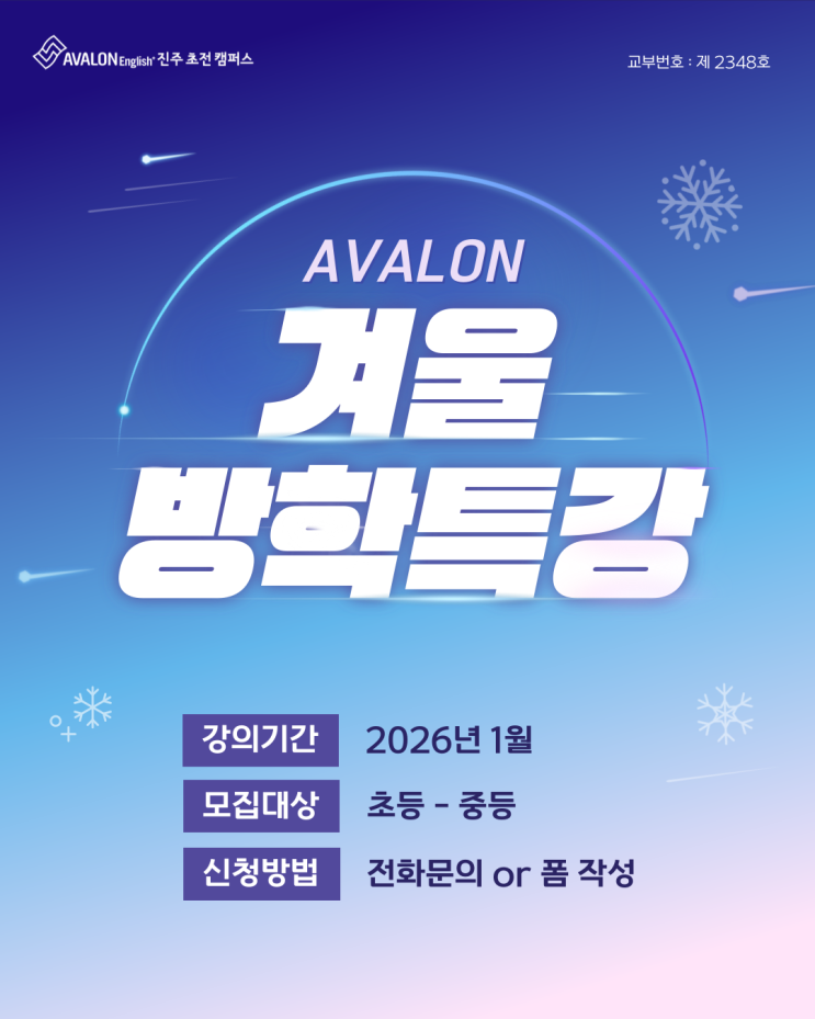 ❄️ 아발론 겨울방학 특강 오픈! 4주 만에 확실한 성장 만드는 집중 프로그램 ( ↓↓↓ 아발론.랭콘 진주혁신점 겨울방학 특강 모집 게시물 ↓↓↓) 안녕하세요 아발론 어학원입니다. 겨울방학은 1년 중 영어 실력이 가장 빠르게 성장하는 시기입니다. 학교 수업 부담은 줄고, 집중력은 높아지고, 아이들이 새로운 활동에도 적극적이기 때문이죠. 강의 기간 : 2026년 1월 대상 : 초등 ~ 중등 신청 방법 : 전화 문의 또는 글 하단의 네이버 폼(QR) 작성 아발론어학원 초전점은 2026년 겨울방학을 맞아 ✔ 실력 성장 ✔ 학습 습관 확립 ✔ 즐기며 배우는 몰입 경험 이 세 가지를 모두 담은 <성장 중심 겨울방학 특강 프로그램&g....... <img src="https://blogthumb.pstatic.net/MjAyNTEyMTJfNzUg/MDAxNzY1NTI0ODMzMzQy.sjHVXjZkfuVMorYm-ED-jhLxSJhZWXhL2wGmt1dZtiMg.wNX0lMa1EkjjiR3I0etSKRwFirFD367PgamWqbetkmIg.PNG/001.png?type=s3" />