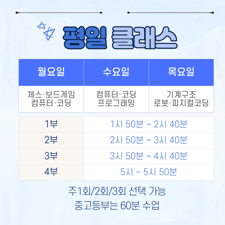 안녕하세요. 강쌤코딩입니다. 2026년 새 학기를 맞이하여 평일 및 주말 수업 시간표를 안내드립니다. 학생들의 학년 진급과 학교 하교시간 변동을 고려하여 2026학년도 기준으로 반 편성이 진행됩니다. 2026 신학기 수업 시간표 아래 시간표 이미지를 참고해주세요. ✅ 수업 안내 학년 및 수준별 맞춤 반 편성 주 1회 / 2회 / 3회 선택 가능 소수 정예 그룹 수업 진행 사고력 · 코딩 · 로봇 · AI 융합 교육 3명 이상 그룹 구성 시 다른 시간대 개설도 가능합니다. (상담 후 신규 반 개설) ✅ 이런 학생들에게 추천합니다 ✔ 컴퓨터 코딩을 처음 시작하는 학생 ✔ 로봇·피지컬 컴퓨팅에 관심 있는 학생 ✔ 중·고등학교 정....... <img src="https://blogthumb.pstatic.net/MjAyNjAyMjJfNjQg/MDAxNzcxNzUxOTU3MTEw.gi8llhOhJR1nfKU78QkYYywvgriJdAzPGDHpcUC09iwg.wVoDyFa76k7cYeBtSLbAhHWh-SV3av37ABn6nJOgMVog.PNG/%C1%A6%B8%F1%C0%BB_%C0%D4%B7%C2%C7%D8%C1%D6%BC%BC%BF%E4._%289%29.png?type=s3" />