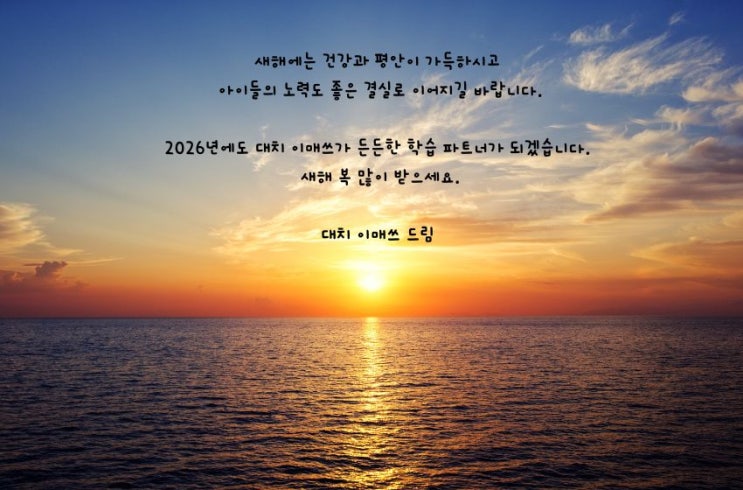 안녕하세요. 영재 수학 및 국제학교 수학 전문 대치 이매쓰입니다. 새해가 밝았습니다. 지난 한 해 동안 각자의 자리에서 최선을 다해 달려오신 학생들과 학부모님들 모두 진심으로 수고 많으셨습니다. 새해에는 계획하신 일들이 차분히 자리 잡고 아이들의 노력 또한 눈에 보이는 성장으로 이어지는 한 해가 되길 바랍니다. 무엇보다 건강이 가장 중요한 시기이니 겨울철 컨디션 관리에도 꼭 신경 써 주시길 바랍니다. 대치 이매쓰는 새해에도 겨울방학 수업으로 분주한 시간을 보내고 있습니다. 짧은 방학을 허투루 쓰지 않으려는 학생들의 집중력 덕분에 교실 안은 새해 시작부터 열기로 가득합니다. 한 해의 출발선에서 무리한 선행보다 꼭 필....... <img src="https://blogthumb.pstatic.net/MjAyNjAxMDNfMjY1/MDAxNzY3NDA1NzMxNjk5.JzRyjTgJnpJw7pixKYUxyez2LNfnBAOV-3gLBvLWp7Ug.79KK4WzHBc7E7H_to1szqgkioiyBPY0uJz9OnEoCUKEg.JPEG/%B4%DC%B6%F4_%C5%D8%BD%BA%C6%AE.jpg?type=s3" />