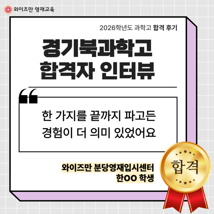 과학이 즐거워서 와이즈만에 첫발을 내딛은 학생. 비슷한 관심을 가진 친구들과 함께 배우고, 먼저 같은 길을 걸어간 선배들의 합격 후기를 들으며 막연했던 목표는 “나도 저 학교에 가보고 싶다”는 바람으로 바뀌었습니다. 그리고 그 바람은 현실이 되었습니다. 오늘은 약 8:1의 높은 경쟁률을 뚫고 경기북과학고에 합격한 와이즈만 분당영재입시센터 한○원 학생의 합격 스토리를 전해드립니다. 1단계 전형 자기소개서를 많이 고민했어요 1단계 전형을 준비할 때는 자기소개서 작성에 가장 신경을 썼습니다. 글자 수가 정해져 있다 보니, 한정된 분량 안에 최대한 많은 의미를 담으려고 했습니다. 활동을 단순히 나열하기보다는 ‘이 활동을....... <img src="https://blogthumb.pstatic.net/MjAyNjAyMjRfMjI2/MDAxNzcxODk4MDc4NzY4.rItI3GyRuEGdtbX5Hxe1h88qls4qEA0yh5s8WGgpSEgg.GcP4gCqaoDp0gpEH36MbZC3bltmgyB6jyb5EOcqmLNEg.PNG/%C7%D5%B0%DD%BB%FD-%C8%C4%B1%E2_%B0%E6%B1%E2%B0%FA%C7%D0%B0%ED%B5%EE%C7%D0%B1%B3-002_%281%29.png?type=s3" />