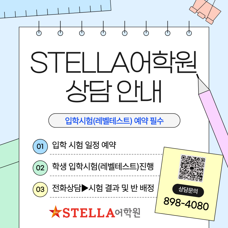 2026년 3월부터 스텔라어학원 입학 상담은 학생 입학 시험(레벨테스트) 예약 및 진행 후 결과 및 최종상담은 익일 전화상담으로 진행됩니다. (시험 당일 결과 상담은 불가하오니 양해 부탁드립니다.) 상담 예약은 학원 전화(051-898-4080) 또는 카카오톡(stella4080)으로 가능합니다. <img src="https://blogthumb.pstatic.net/MjAyNjAyMjBfMjQx/MDAxNzcxNTgyNzUxNTg1.9zhcQ8Dj1CH7ITkrDU85u0wsSn6v-TllVZbidY-_Tccg.LEu6x4IA1hNZ8WDc4C_-t7traXZfzTQXyvtXFwhU9Ecg.PNG/%C1%A6%B8%F1%C0%BB_%C0%D4%B7%C2%C7%D8%C1%D6%BC%BC%BF%E4._%284%29.png?type=s3" />