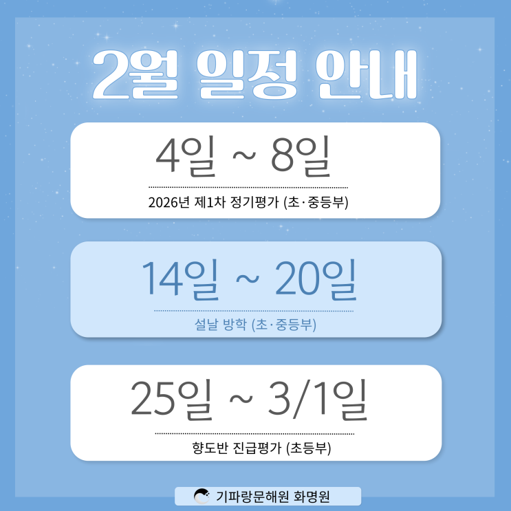 안녕하세요 기파랑문해원 화명원입니다 :D 기파랑 가족 여러분! 어느덧 2026년 새해가 밝었습니다! 새해 복 많이 받으세요 ㅎㅎ 우리 기파랑 화명원도 새해를 맞아 새 학기를 시작했습니다. 새롭게 기파랑에 들어온 4학년이 되는 친구들과 초등부에서 중등부로 올라간 친구들처럼 새로운 반, 새로운 자리에 적응하려고 애쓰는 기특하고 예쁜 모습들이 많이 보이는 1월입니다 ㅎㅎ 2월에는 기파랑문해원의 정기평가와 설날 방학 등 많은 일정들이 예정되어 있는데요, 우리 친구들의 적응에 도움이 되길 바라는 마음으로 오늘은 2월 일정을 안내해 드릴게요! 우선 2월의 둘째 주인 4일~8일까지는 2026년의 첫 정기평가가 시행될 예정입니다. 2026년....... <img src="https://blogthumb.pstatic.net/MjAyNjAxMThfMjE0/MDAxNzY4NzQ2Mzk1OTU4.v-S73ke26qjfw58mP-rzy7lasAVUXYsvB05K8JKdc_8g.PI3kVL2WcYl_aLlD0kRiUMq0UToVUWqA3TEDEaglC-4g.PNG/%C1%A6%B8%F1%C0%BB-%C0%D4%B7%C2%C7%D8%C1%D6%BC%BC%BF%E4_-013_%281%29.png?type=s3" />
