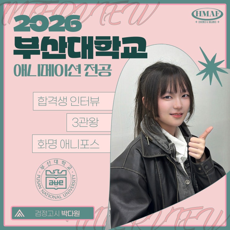 2026 부산대학교 디자인학부 애니메이션전공 수시 합격생 인터뷰입니다. 인터뷰는 부산 화명 애니포스 만화학원의 민제우 원장님이 직접 진행합니다. 촬영 - 선우T 2026 화명애니포스 4기 중앙대, 경기대, 홍익대, 청강대, 상명대, 한성대, 건국대, 공주대, 부산대, 동아대, 경성대, 계명대, 동서대 이 외 다수 대학 합격을 축하합니다! 위 결과는 화명애니포스 수시반 단 27명만의 결과입니다. 이 학생은 화명애니포스 중복합격자로, 본 게시글은 부산대학교 위주의 인터뷰 내용이 담겨있습니다. 제우T > 부산대학교 애니메이션전공 합격을 축하합니다. 부산대에 지원한 계기가 있나요? 다원 > 부산대 애니전공이 소수 인원인 만....... <img src="https://blogthumb.pstatic.net/MjAyNjAxMjdfMjk4/MDAxNzY5NTExNDc3MTE0.na7rKbfEotHQYrDDJhqi5dTpBuMhNYy2bCT189wcp-gg.2LprnIPQ0RkDBDdC4R8-y7s-q9-kQPQgOn-mcYuVo9Qg.JPEG/%B9%DA%B4%D9%BF%F8_%BA%CE%BB%EA%B4%EB_%282%29.jpg?type=s3" />