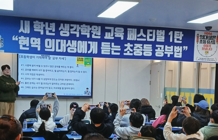 안녕하세요^^ 생각학원입니다. 지난 2월 10일 우리 아이들의 성공적인 새 학년을 위해 야심 차게 준비한 생각학원 새 학년 동기부여 교육 페스티벌 1탄 임민찬 작가 초청 강연회가 학부모님과 학생들의 뜨거운 열기 속에 진행되었습니다. 생각학원 새 학년 동기부여 교육 페스티벌은 단순한 공부법 전달을 넘어 학생들 스스로 공부해야 할 이유(Why)를 찾고 내면의 힘을 길러주는 '가치 성장 프로젝트'의 시작이었습니다. 현역 의대생 멘토의 현실적인 조언으로 아이들의 마음에 '나도 할 수 있다'는 강력한 불씨를 지핀 그 생생한 현장 소식을 지금 바로 전해드립니다. “공부를 왜 해야 하는지 모르겠대요.” “시켜도 움....... <img src="https://blogthumb.pstatic.net/MjAyNjAyMTNfOTYg/MDAxNzcwOTEyNDY5Mzkx.PIYVXUaNhcT3I6A_NvnK5KlHW2iHBsnjL69fUi2uKLIg.4UML6Y3quy-dAHKVf4dVBYXpla2Ey8xLDso0_BfEdKog.PNG/image.png?type=s3" />