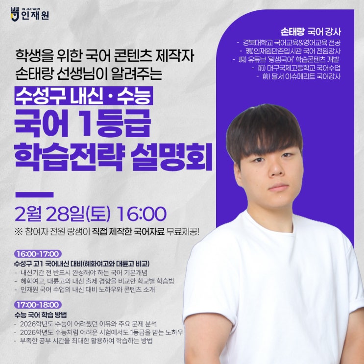 안녕하세요! 수성구 만촌동 영어 국어 컨설팅 전문 인재원 만촌입시관입니다. 2026학년도에 입시제도가 급변한 만큼 학생들도 학부모님들께서도 많이 혼란스러우셨을텐데요. 그만큼 학습전략이 중요해진 시기에 수성구 국어, 수능국어 학습 전략을 중심으로 국어 과목에 대해 자세히 설명을 드리려고 합니다. 2월 28일 (토) 설명회 내용 1. 수성구 국어 내신 대비 설명회 (혜화여고와 대륜고 비교) (16시-17시) • 내신기간 전까지 반드시 완성해야 하는 국어 기본 개념 • 혜화여고와 대륜고의 내신 출제 경향을 비교한 학교별 학습법 • 인재원 국어 수업의 내신 대비 노하우와 콘텐츠 소개 2. 수능 국어 학습 방법 설명회 (17시-18시) • 작년....... <img src="https://blogthumb.pstatic.net/MjAyNjAyMTlfNSAg/MDAxNzcxNDc5NzE1NDM3.-BYM3Mt9TBDS5FvsiBB1QELbbmYjIw3vq7VMn-unGUIg.OpOTum0x2eMVPMkGZBdq8j6Ci6K8-UeKy8IHswRCHikg.JPEG/%C5%C2%B6%FBT_%BC%B3%B8%ED%C8%B8_%C4%AB%B5%E5%B4%BA%BD%BA.jpg?type=s3" />