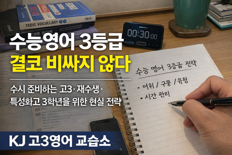 수능영어 3등급, 결코 비싸지 않다 ― 수시 준비 고3 · 재수생 · 특성화고 3학년을 위한 현실 전략 KJ고3영어 교습소 수능 영어는 절대평가다. 그래서 많은 학생들이 “3등급이면 충분하다”고 말한다. 그러나 막상 준비를 시작하면 3등급이 생각보다 멀게 느껴진다. 이유는 단순하다. 영어는 감이 아니라 구조와 반복의 과목이기 때문이다. 특히 수시를 준비하는 고3, 한 번 더 도전하는 재수생, 수능 영어가 낯선 특성화고 3학년 학생들에게 3등급은 “높은 벽”처럼 보인다. 하지만 분명히 말할 수 있다. 수능영어 3등급은 비싸지 않다. 다만, 제대로 된 방식으로 배웠는가가 문제다. KJ고3영어 교습소는 “많이 푸는 영어”가 아니라, “완전....... <img src="https://blogthumb.pstatic.net/MjAyNjAyMjJfMTIz/MDAxNzcxNzYyNjYyNTgz.54pU0Zvb1aT9g4FcqAzTAF5uQrmL764tiT3PZotvTeAg.PbR_gqOAPmXMIwXyD-ySEpG0-IU8j3wD02laY_3tdiQg.PNG/ChatGPT_Image_2026%B3%E2_2%BF%F9_22%C0%CF_%BF%C0%C8%C4_09_08_46.png?type=s3" />