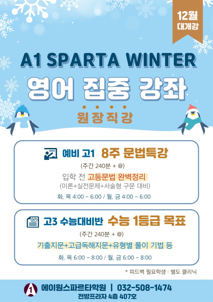 안녕하세요. 에이원 스파르타입니다. 에이원의 영어 특강은 단순 진도 수업이 아니라 부평내 고등학교 내신 문제를 기반으로 제작한 에이원만의 자체교제를 사용합니다. <예비고1 8주 문법 특강> ▶ 커리큘럼 및 교재 1. 서술형 구문 연습 (에이원자체제작) 2. 부평지역내 고등학교 내신 실전문제 (에이원자체제작) <고3 수능대비반 수능1등급목표 특강> ▶ 커리큘럼 및 교재 1. 기출지문 + 고급독해지문 연습 (에이원자체제작) 2. 유형별 풀이기법 (에이원자체제작) ▶ 에이원만의 speciality!! 자기주도 훈련형 프로그램 1.계획 2.실천 3.피드백 4.학생본인이 오류체크 전화 주세요. P.N : 032-508-1474 (상담 예약필수) 부평에이....... <img src="https://blogthumb.pstatic.net/MjAyNTEyMjBfMTk4/MDAxNzY2MjAxOTAwMDU5.n5yS4kjWw-uunMyX1h9ClKvxx33PeWFnoNrT7FkgAcMg.MAWHG4BIPG9N1pEx52aQ4lftWdq0_2beTic_Zid6CUog.JPEG/%B0%DC%BF%EF%B9%E6%C7%D0%C6%AF%B0%AD.jpg?type=s3" />