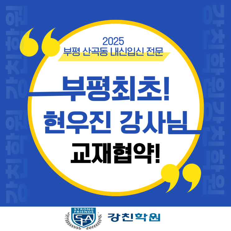 부평에서 현우진 교재로 공부할 수 있습니다 (부평 최초!강친학원 단독) 메가스터디 대표강사 현우진 선생님의 교재 사용 외부 시행학원에 선정되었습니다! "노베랑 시발점 교재가 좋다던데... 혼자 하기엔 너무 어려워요." 수능 수학 인강계 압도적 1위, 메가스터디 대표강사 현우진 선생님의 교재. 전국 수험생들이 선택하는 그 교재를, 이제 부평에서 강친학원 수업으로 배울 수 있습니다. 강친학원 부평캠퍼스가 인천 부평 지역 최초로 현우진 선생님 교재 사용 외부 시행 학원에 선정되었습니다. 혼자 하기 어려웠던 노베, 시발점 교재를 이제 전문 강사의 체계적인 지도로 완벽하게 마스터할 수 있습니다. 현우진 선생님, 왜 특....... <img src="https://blogthumb.pstatic.net/MjAyNTEyMjFfMTk2/MDAxNzY2MjgzMDYxNjM3.93SRDFC4kU1xxN3j-T1Y8YM99VFalkJEJNayi2toz3og.MRdteKEhaET9oF1c7yrO6afn7UWovxvtOCfudVZCoHog.PNG/%C1%A6%B8%F1%C0%BB_%C0%D4%B7%C2%C7%D8%C1%D6%BC%BC%BF%E4._%281%29.png?type=s3" />