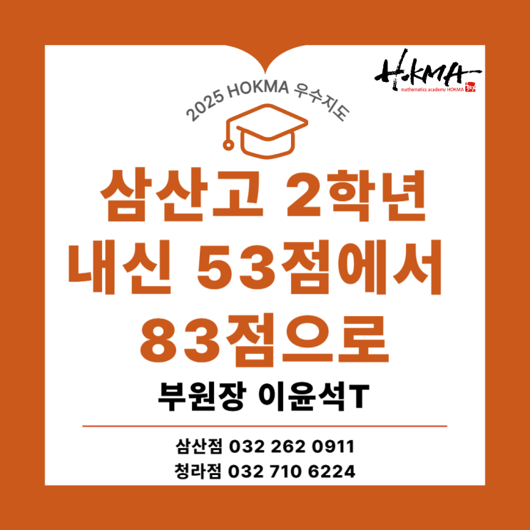 안녕하세요. 삼산동 수학학원, 호크마수학학원입니다. 고등학교 수학을 유난히 어려워하며 아무리 성실히 공부해도 성적이 늘 50~60점대에 머물러 있던 한 학생이 있었습니다. 하지만 한 학기 동안의 집중적인 지도 끝에 내신 성적을 30점 끌어올린 삼산고등학교 2학년 배OO 학생의 실제 이야기를 전해드리려고 합니다. 변별력 있는 문제 앞에서 늘 막히던 학생이, 어떻게 문제 해석의 벽을 넘고 확실한 성적 반등을 이뤄낼 수 있었을까요? 삼산동 수학학원 호크마 부원장 이윤석 선생님의 고2 우수지도 사례, 함께 살펴보겠습니다. Problem 삼산고등학교 2학년 배OO 학생은 고등학교 수학의 높은 난이도 앞에서 점점 자신감을 잃어가고 있었습니....... <img src="https://blogthumb.pstatic.net/MjAyNTEyMjJfNjcg/MDAxNzY2NDA2Nzk4MTAy.uQkPF3_nqcTR6CoYEnTYA-dtE-Uz1PBywEqwtuBDk10g.-X5LbYVW4-He9DUiY5zaQ2MDcbk1VOIdXQUoZxPnRHwg.PNG/%BB%EF%BB%EA%B0%ED_2%C7%D0%B3%E2_30%C1%A1_%BB%F3%BD%C2%BB%E7%B7%CA_%C0%CC%C0%B1%BC%AEt-001.png?type=s3" />