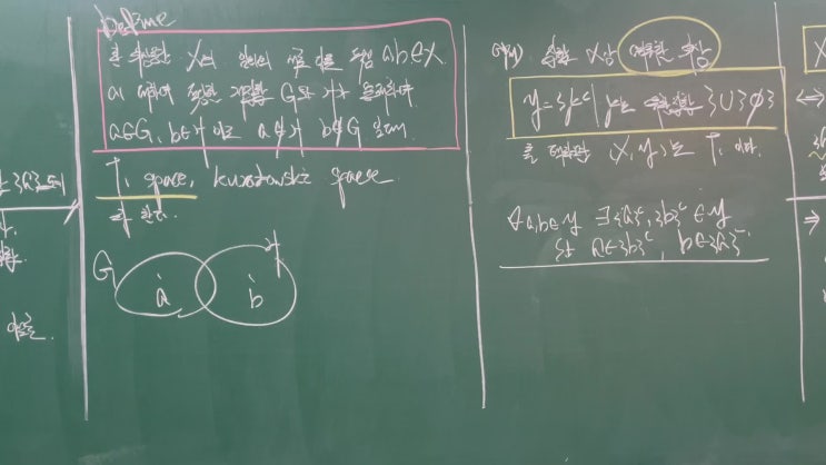 T1 공간과 단집합의 폐집합 성질 T1 공간이란? 위상수학에서 T1 공간(Fréchet space)은 분리공리 중 하나로, 다음과 같은 특성을 지닙니다. 정의: 임의의 서로 다른 두 원소 x, y에 대하여, x는 포함하되 y는 포함하지 않는 열린집합이 존재하고, 동시에 y는 포함하되 x는 포함하지 않는 열린집합도 존재하는 위상구조 이러한 조건은 하우스도르프 조건(T2)보다 약한 분리성을 요구합니다. T2에서는 두 열린집합이 서로소여야 하지만, T1에서는 교집합을 가져도 괜찮습니다. 대표 사례: 여유한 위상 여유한 위상(cofinite topology)은 T1 공간의 전형적인 예시입니다. 구성 방식: 무한집합 X 위에서, 공집합과 유한집합의 여집합들을 열린집합으....... <img src="https://phinf.pstatic.net/image.nmv/blog_2025_12_23_774/Jpl9O2znrb_01.jpg?type=f480x480" />