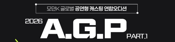 Audition Group Performance 안녕하세요 세계로 뻗어나가는 모던~K 입니다! 여러분 모두 잘 지내고 계신가요? 추운 날씨가 이어지는 2월 감기와 건강 관리에 더욱 유의해야하는 요즘인데요! 오늘은 여러분의 마음을 열정과 에너지로 따뜻하게 채워드릴 소식을 하나 가져왔습니다 ~ 바로바로 ~ 글로벌 공연형 캐스팅 연합오디션 2026 A.G.P Part.1 소식입니다! ▼지난 2025 AGP Part.2 현장 보러가기▼ A.G.P가 대체 무엇인가요? A.G.P는 바로바로 국내 최대 규모의 공연형 연합오디션인데요! 일반적인 오디션과 다르게 실제 콘서트 무대처럼 화려한 조명 아래서 나의 퍼포먼스와 끼를 맘껏 발산할 수 있는 자리랍니다. A.G.P가 더 특별....... <img src="https://blogthumb.pstatic.net/MjAyNjAxMjRfNjYg/MDAxNzY5MjQ5OTY4ODI3.x4B7KTeHFWxrJUHTqdcf-FHoBK686_kE2sBoatfDbDgg.PHjMuOkNJGI03G7c4_ZRbzyeRMjNm0mGGn7gFYi3n5og.JPEG/SE-5fc2380b-67f5-4ffe-a70e-c41a07810669.jpg?type=s3" />