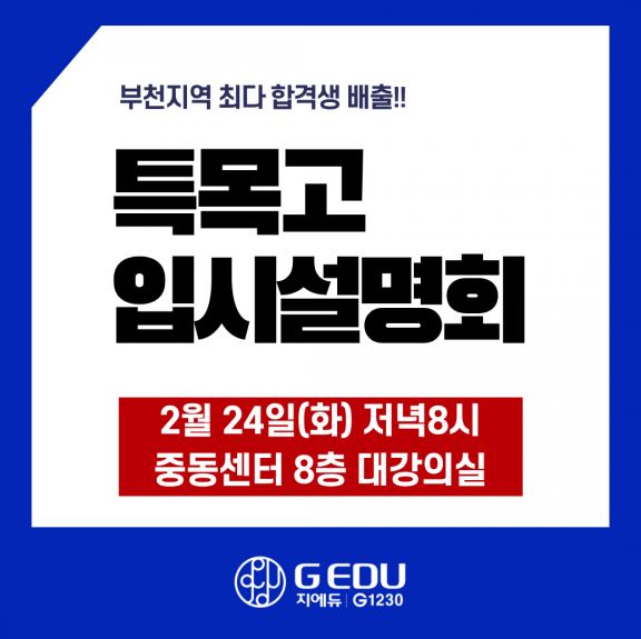 특목고 입시분석설명회 특목고를 꼭 가야하나? 자사고? 국제고? 외고? 면접은 어떻게 준비하나? 2026년 2월24일(화) 저녁8시 지에듀 중동센터 8층 특목고/자사고 합격생 다수 배출 자기소개서 코칭 &면접지도 전문 학교별 모의면접 다수전문가를 통해 훈련 지에듀학원의 노하우와 입시전략을 만나보십시오. 설명회 주요 내용 2026학년도 특목고·자사고 입시 분석 올해 입시의 주요 변화 및 핵심 포인트 학교별 전형 방법 및 경쟁률 특목고 입시 전략 수립 내신, 자기소개서 준비 방법 면접 대비 핵심 포인트 및 실전 팁 ↓↓↓↓↓ 설명회 예약창 ↓↓↓↓↓ [부천중동]특목고 입시분석 설명회 > 설명회 예약 | 특목/대입 전문학원 G EDU ....... <img src="https://blogthumb.pstatic.net/MjAyNjAyMTRfNjEg/MDAxNzcxMDAzNDc2NTM1.DZaSfSZkIK5z-dMsE7nOesyata0eAig9sgVfQk9xRe8g.fdtEU3lxBXZ70HRqCY6vFBcGuThyYjsXeEva0v-0ahgg.JPEG/%C6%AF%B8%F1%B0%ED.JPG?type=s3" />