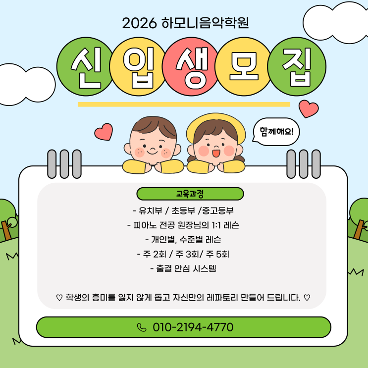 안녕하세요 하모니음악학원입니다! 2026년 새로운 해를 맞이하여 하모니음악학원에서 신입생을 모집합니다 우리 아이의 음악 기초, 하모니음악학원과 함께 시작해보세요! 피아노는 단순한 악기 교육이 아닌 집중력, 인내심, 표현력을 키워주는 중요한 예술 교육입니다. 하모니음악학원에서는 아이 한 명 한 명의 성향과 수준을 고려하여 무리하지 않고, 꾸준히 성장할 수 있도록 지도합니다. 피아노를 배우고 싶은 친구들 예비초등학교 1학년 친구들 모두 환영합니다! 개인별 맞춤 원장 직강 1:1 레슨 올바른 기초 테크닉 지도 연령별 수준별 교재 사용 레파토리 완성 새학기 음악 교육을 고민하고 계시다면 편하게 상담 문의....... <img src="https://blogthumb.pstatic.net/MjAyNjAyMjBfODAg/MDAxNzcxNTU4NDAwNjc1.6dYJ3LbgQk_7EhXs6A7PhjMaViciKEbgeUZLTuPDNGcg.o4iZ-tdDBr_9hLISM1NE-qXQGjm58MPPQVfbQErLtpYg.PNG/%C1%A6%B8%F1%C0%BB_%C0%D4%B7%C2%C7%D8%C1%D6%BC%BC%BF%E4._%281%29.png?type=s3" />
