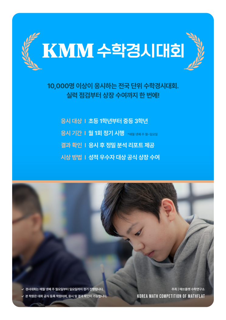 초중등 대상으로 매달 KMM 경시대회를 실시합니다. 난이도는 인천지역 학교 시험보다는 어려운 편입니다. 서울 강남 8학군 학교시험 난이도라 생각하면 됩니다. 시험 실시후 결과에 따라 입상자는 시상합니다. 물론 50점 미만 학생에게는 그에 상응하는 과제도 주어집니다. 매달 실시하는 경시대회를 통해 원생들의 경쟁력을 확인함과 동시에 고등학교 입시에서 살아 남을수 있는 응력을 베가 시키고자 합니다. <img src="https://blogthumb.pstatic.net/MjAyNjAxMjdfMjE4/MDAxNzY5NDc5ODQxMTM2.I7003eznCqGVbgNiGCDsef5LqIArtoySbcCmmQaJMNIg._eE-uRRwsFIkoHPGKDaG7tInZkSHl90K5MoPmjgF1DIg.PNG/KMM_홍보포스터_Blue.png?type=s3" />